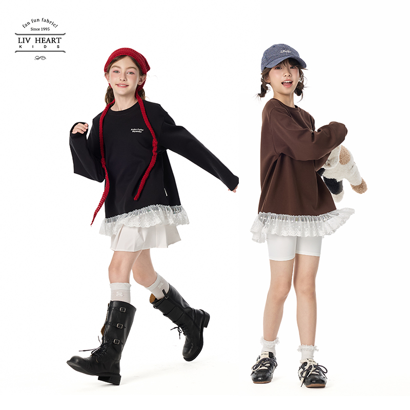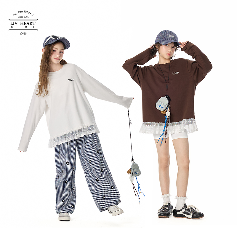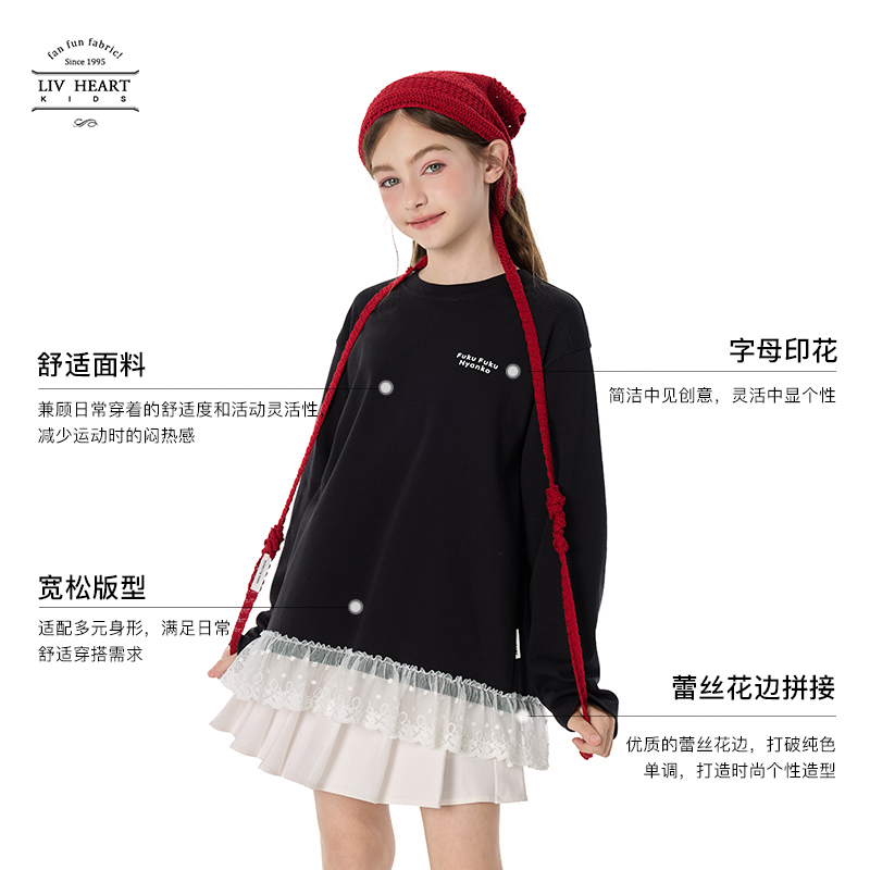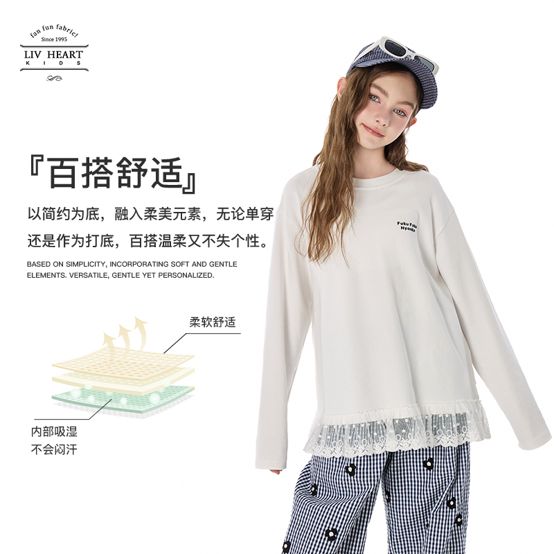 女童圆领上衣 t恤秋2025新款 Livheart kids蕾丝花边拼接女大童长袖