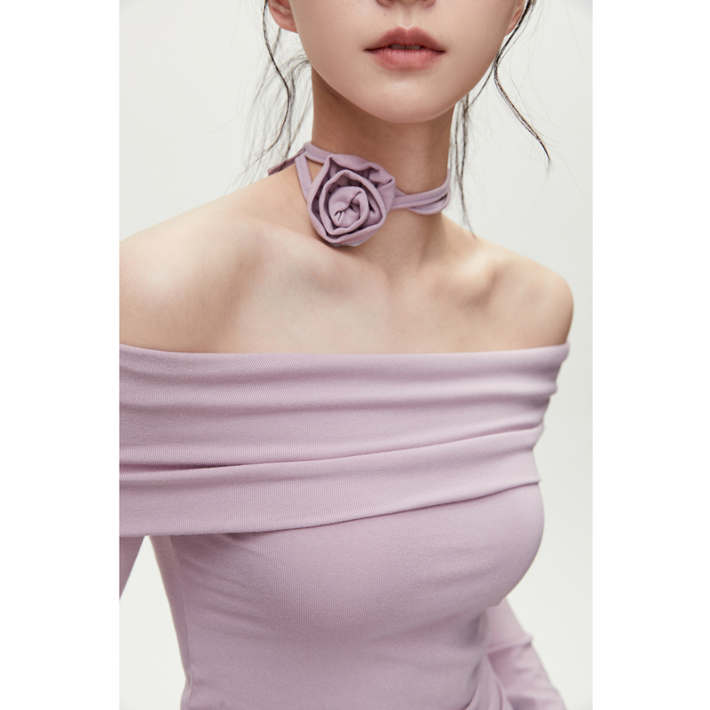 纯欲上衣 女花朵长袖 VIVICATHY2025秋法式 带胸垫锁骨一字肩打底衫