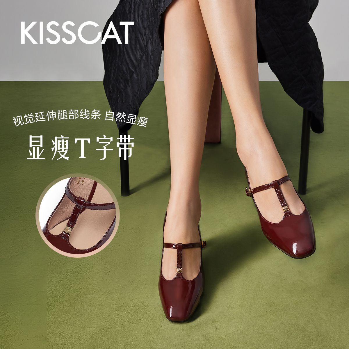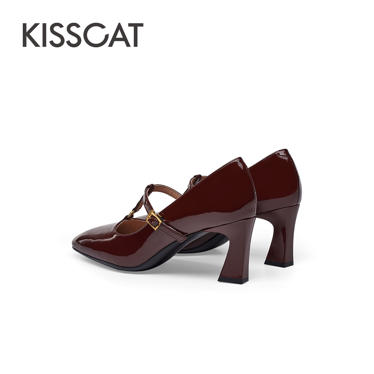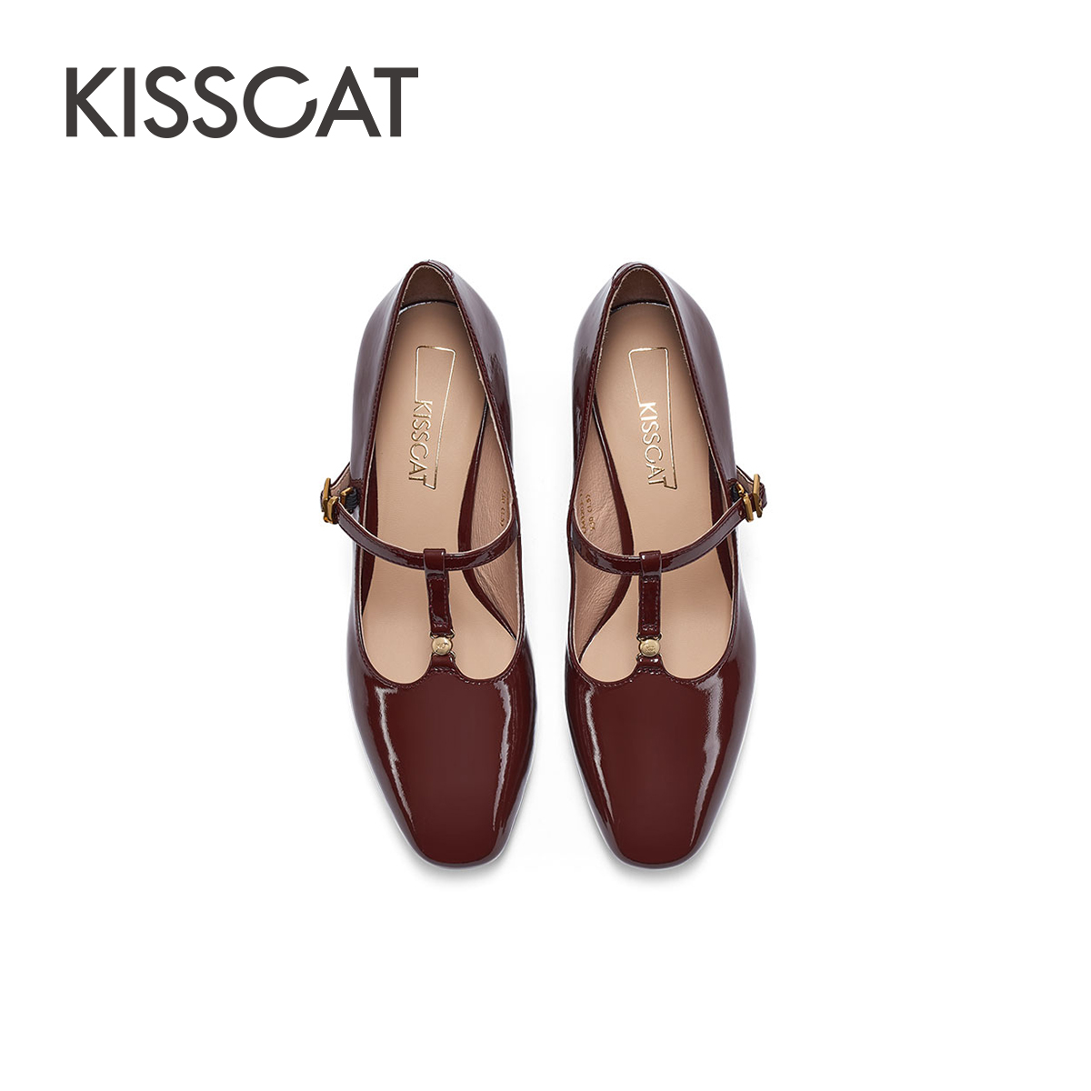 KISSCAT接吻猫玫瑰玛丽珍鞋 女 复古甜美T字带漆皮高跟玛丽珍单鞋