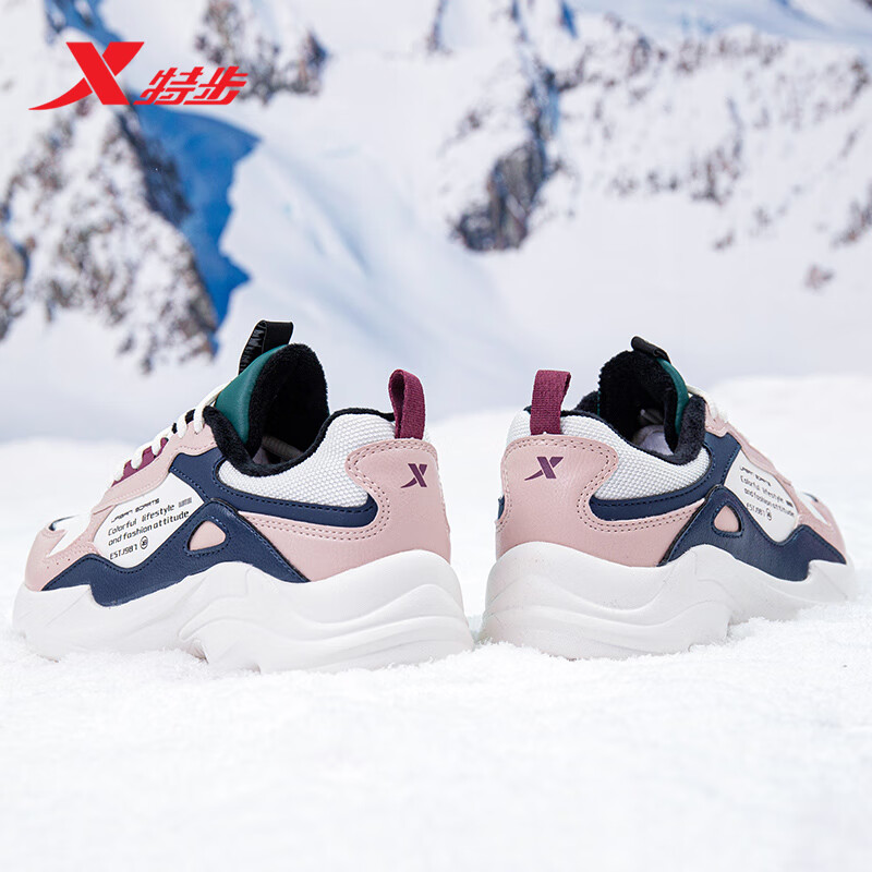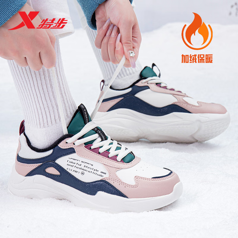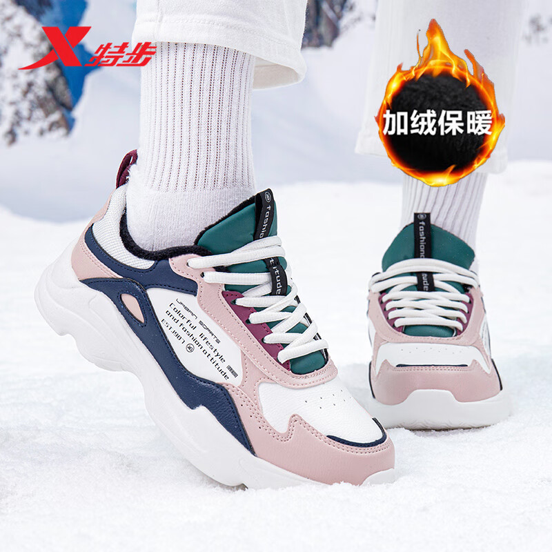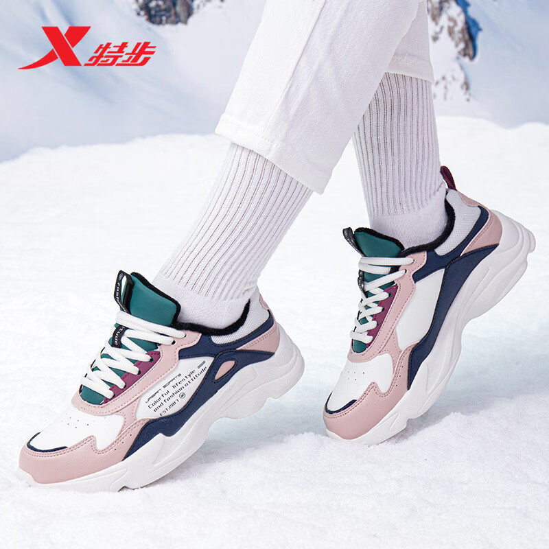 加绒休闲鞋 运动鞋 子冬季 官方旗舰皮面女款 保暖厚底老爹鞋 特步女鞋
