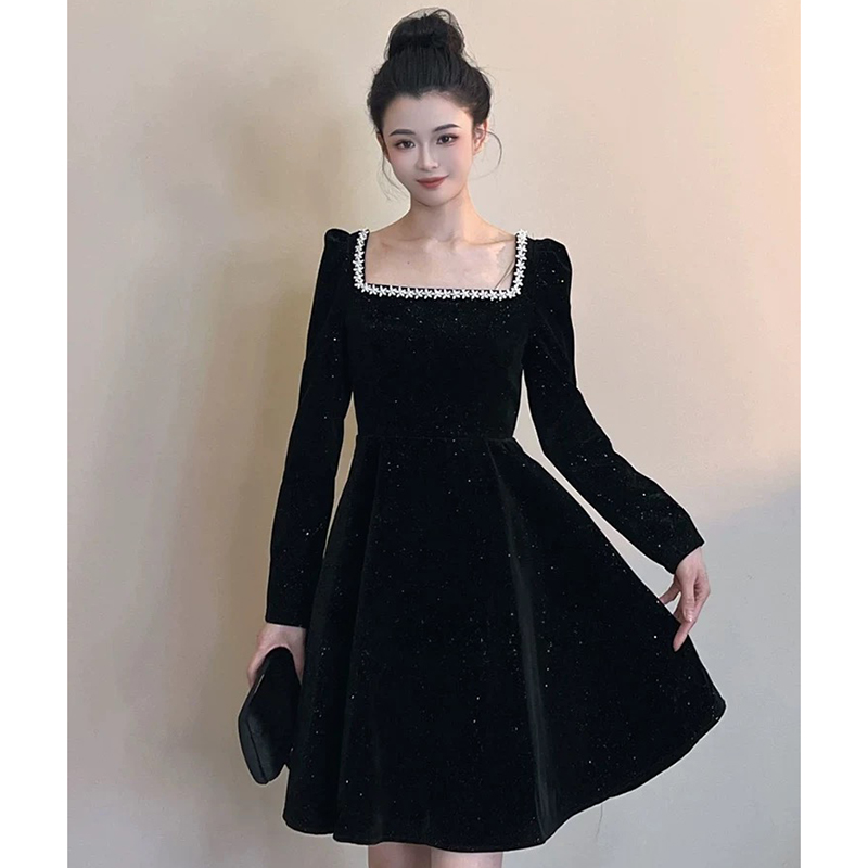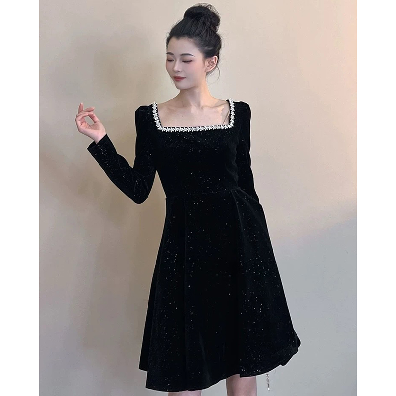 赫本风气质收腰显瘦包臀裙子 新款 黑色方领长袖 连衣裙女2025年秋季