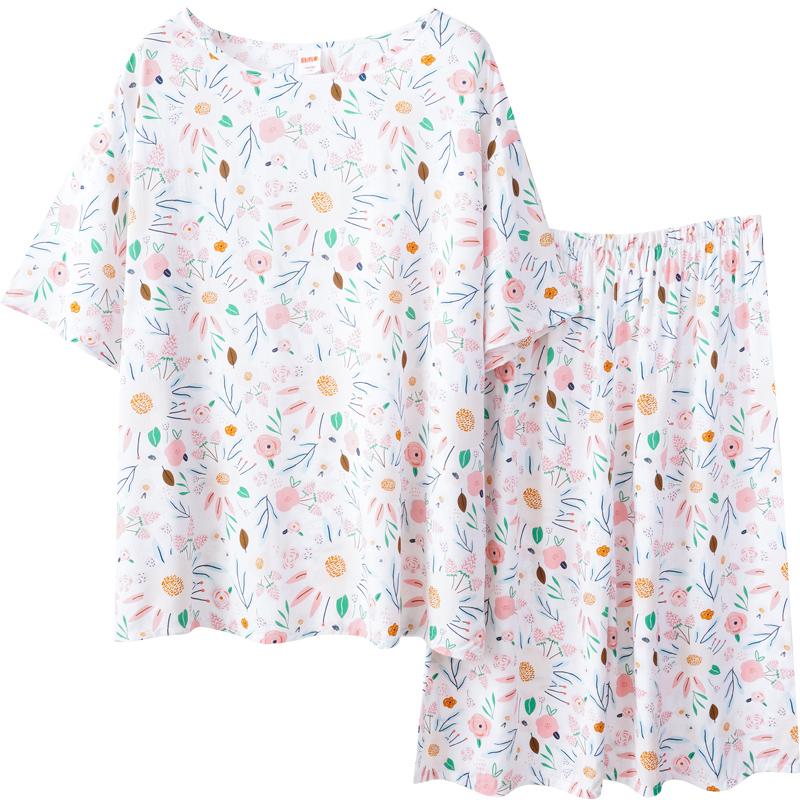 人造棉家居服套装 宜而爽妈妈睡衣女夏中老年绵绸套装 中裤 中袖 薄款