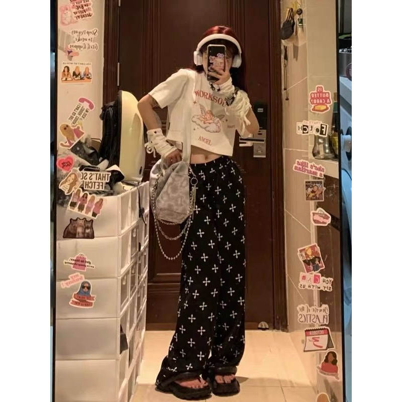高腰垂坠感显瘦十字架印花辣妹休闲直筒拖地长裤 新款 女夏季 阔腿裤