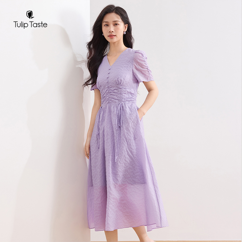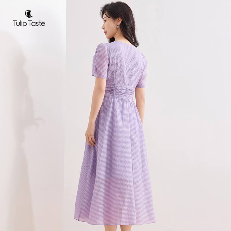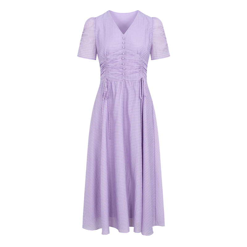 抽褶收腰显瘦格纹A字裙 时尚 郁香菲法式 V领连衣裙女气质优雅夏季