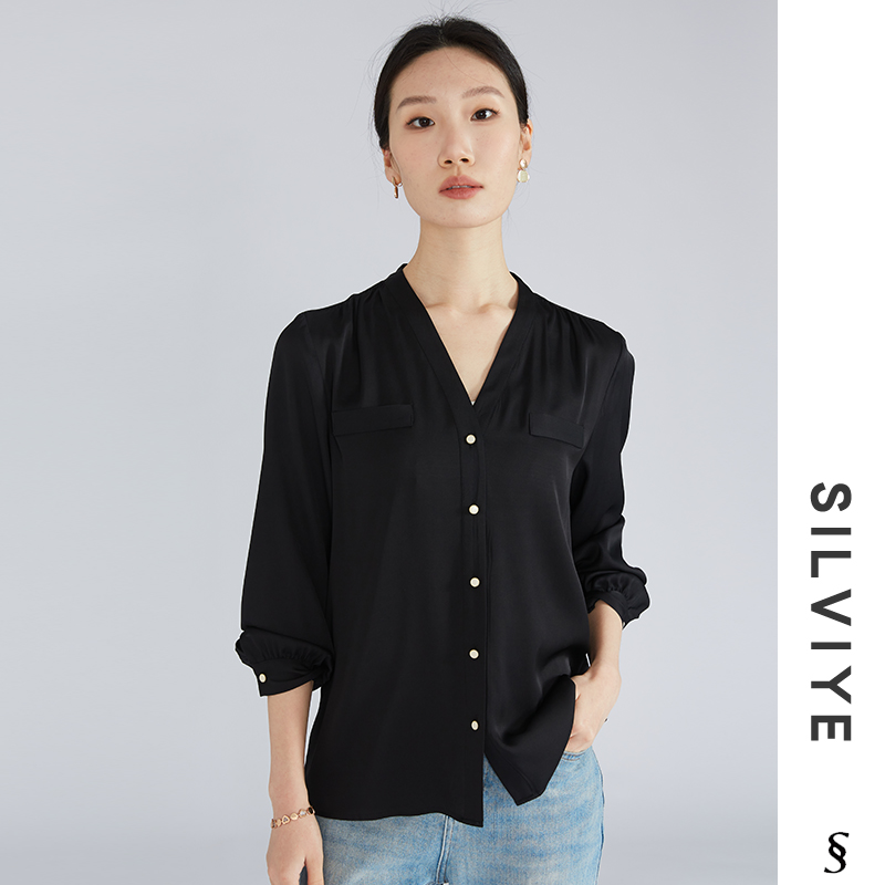 女桑蚕丝弹力双乔上衣女黑色衬衣 衬衫 SILVIYE 溯也真丝V领长袖