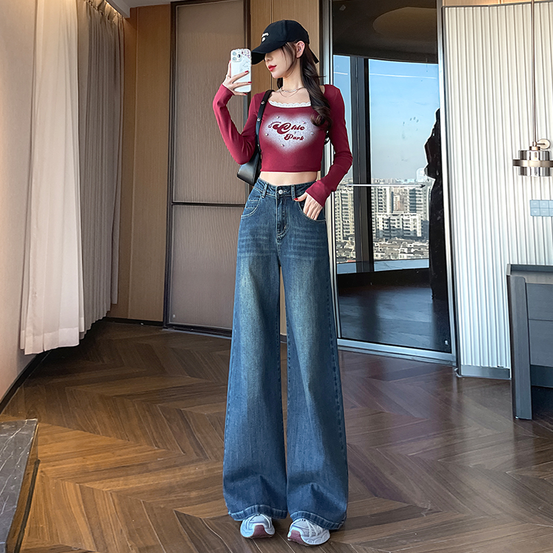 拖地垂感高腰阔腿直筒裤 爆款 女士2025春秋新款 复古宽松微喇牛仔裤