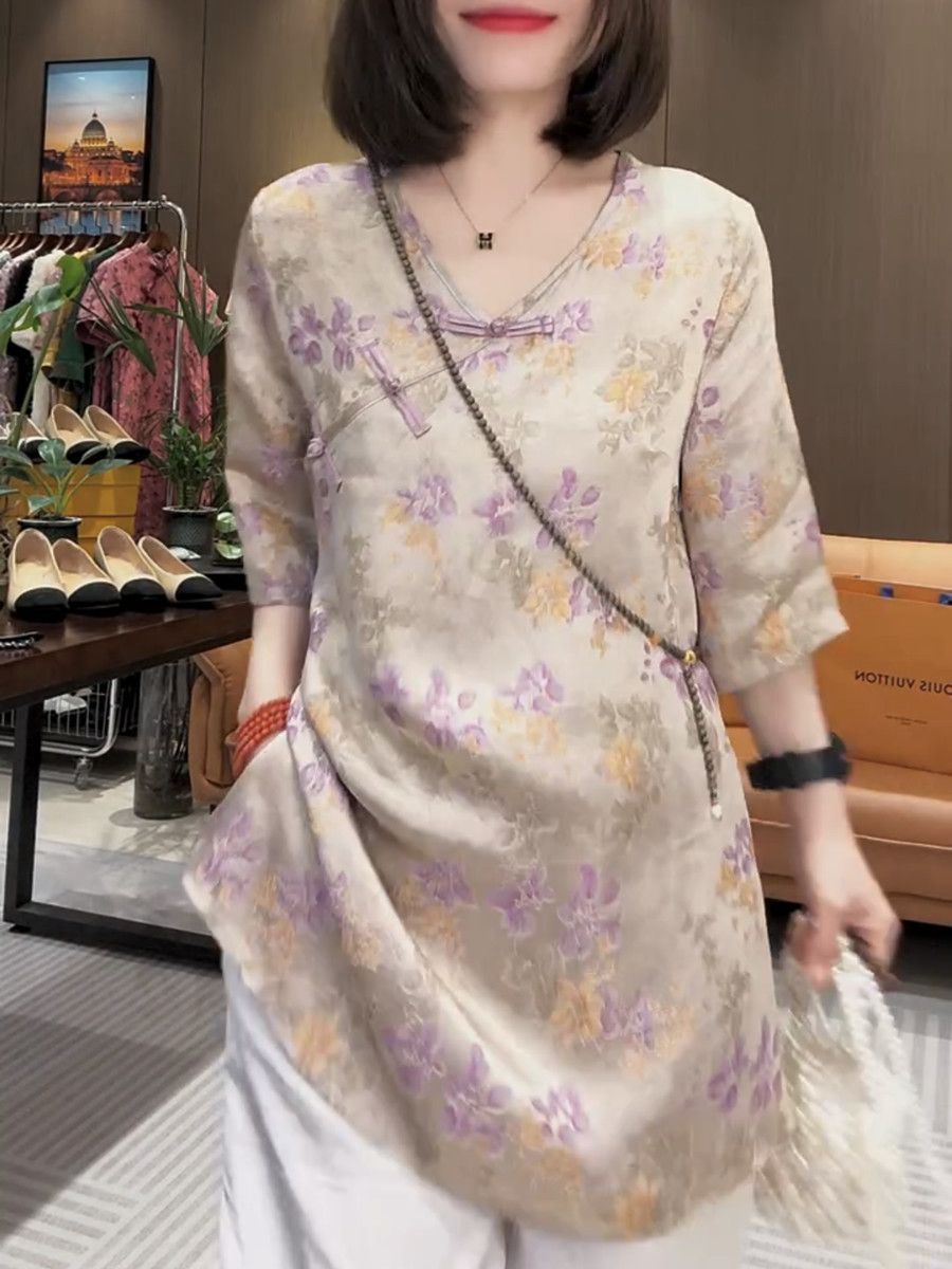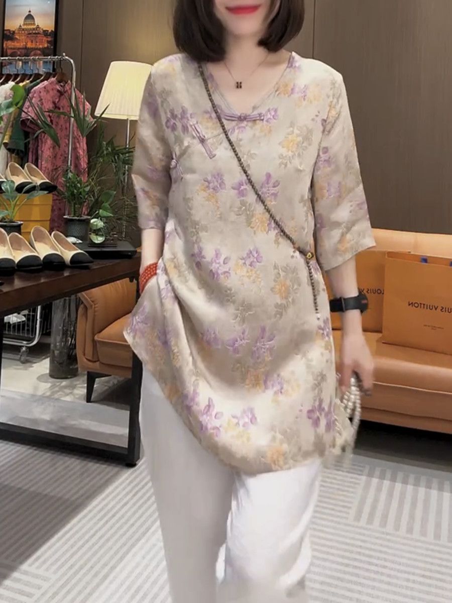 新款 复古印花上衣V领小衫 新中式 气质衬衫 国风洋气盘扣七分袖 夏季