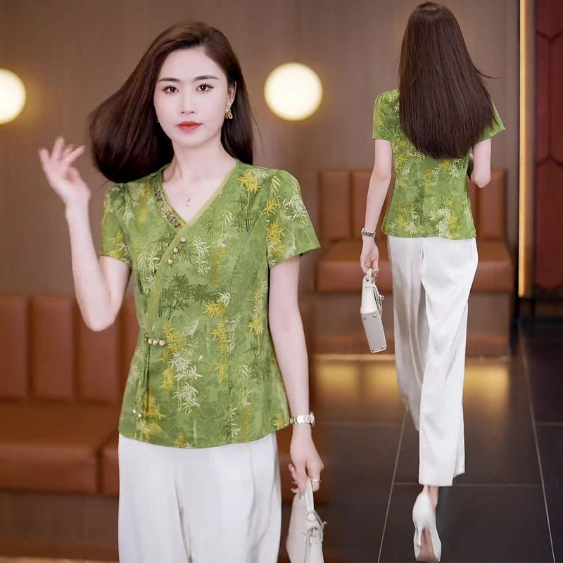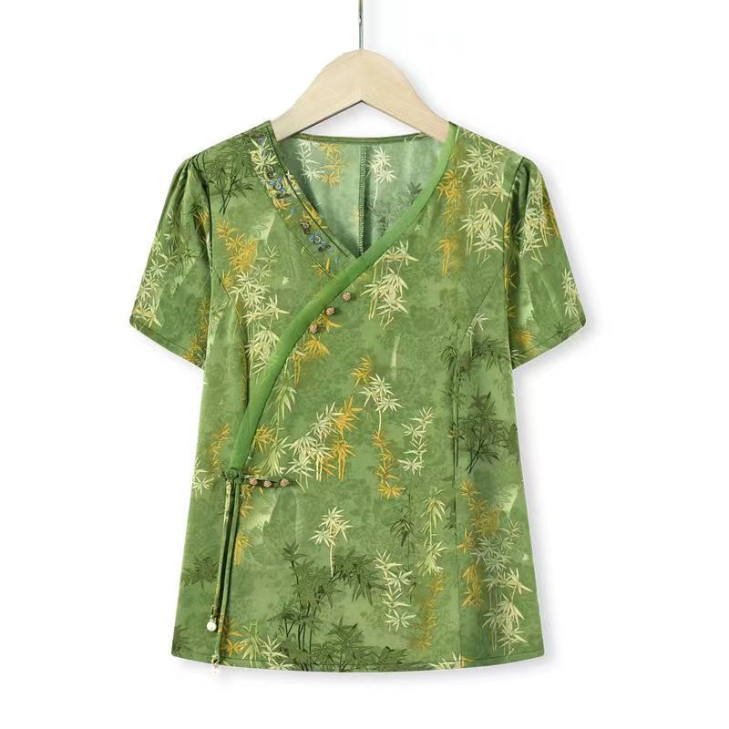 气质衬衫 妈妈装 女士2025时尚 洋气减龄修身 上衣 新中式 V领短袖 夏季
