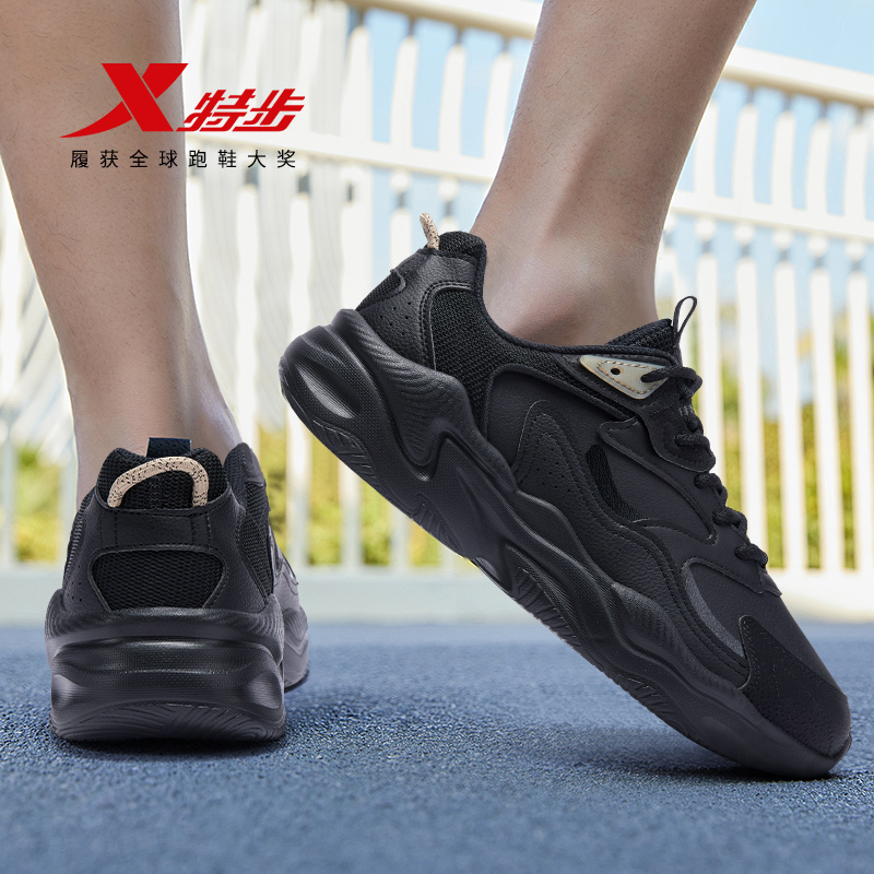 男网面轻便减震跑步鞋 秋冬皮面黑色运动鞋 黑武士2025新款 特步男鞋