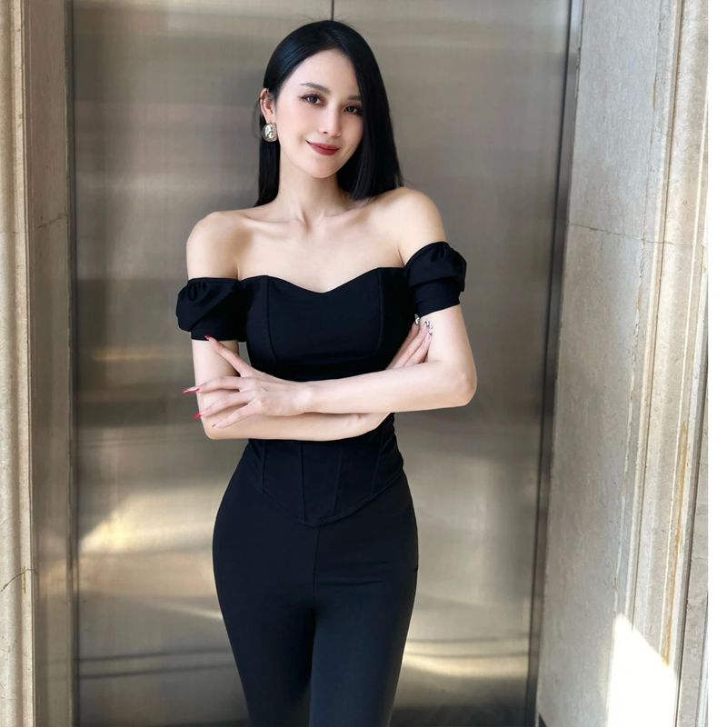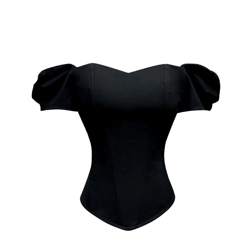 收腰一字肩抹胸绝美独特 鱼骨上衣外穿黑色胸衣束腰女修身 短袖 法式