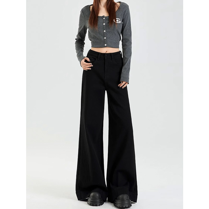 加绒宽松显瘦垂感拖地裤 黑色高腰不贴腿阔腿喇叭牛仔裤 女秋冬新款
