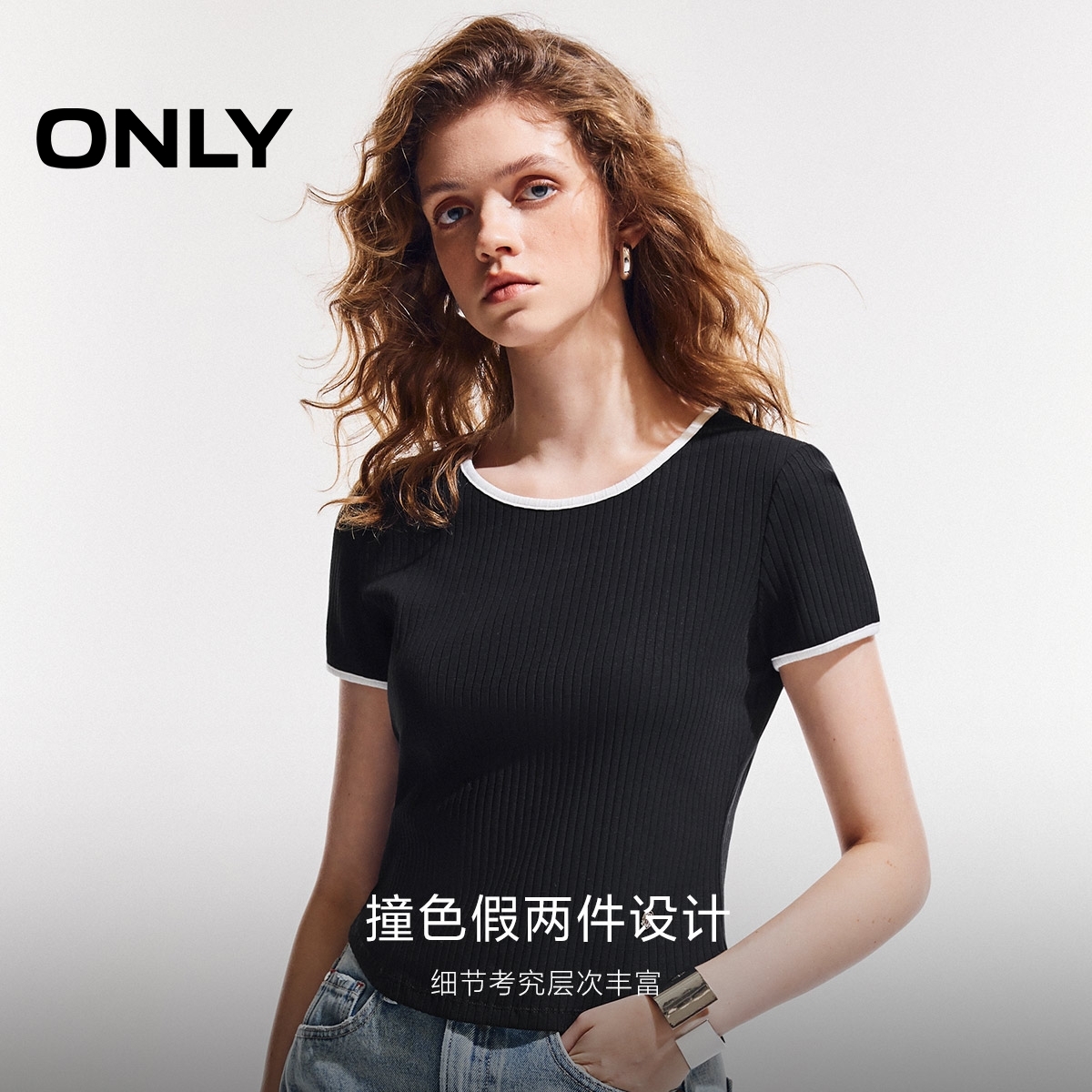 正肩短袖 休闲舒适假两件修身 T恤女 新款 ONLY奥莱2025秋季