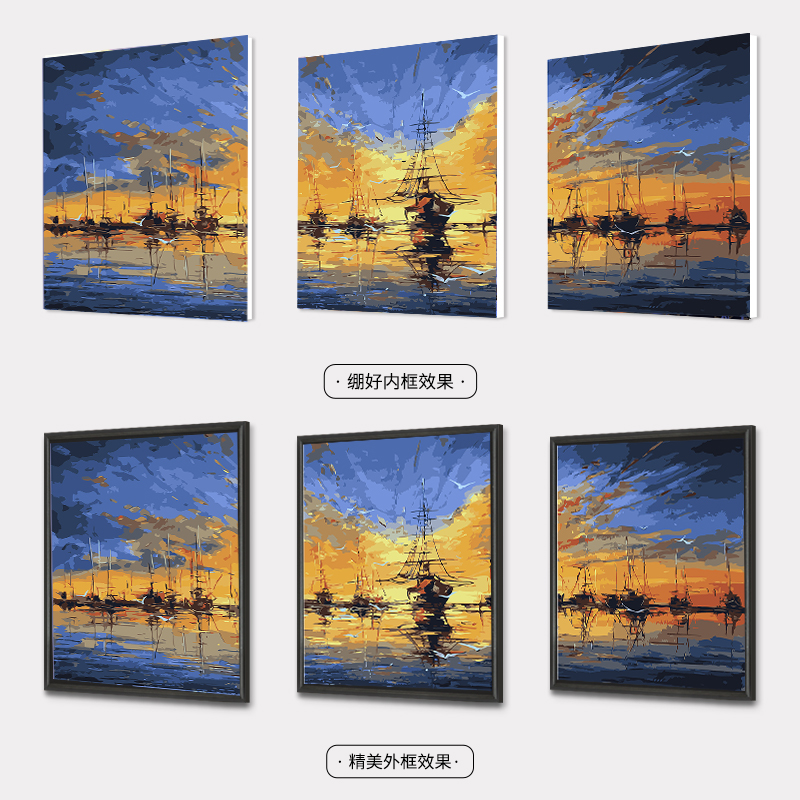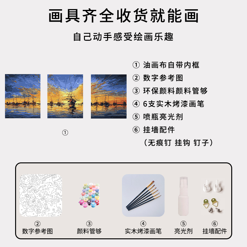 数字油画diy填充填色手工手绘三拼三联客厅床头风景海油彩装 饰画