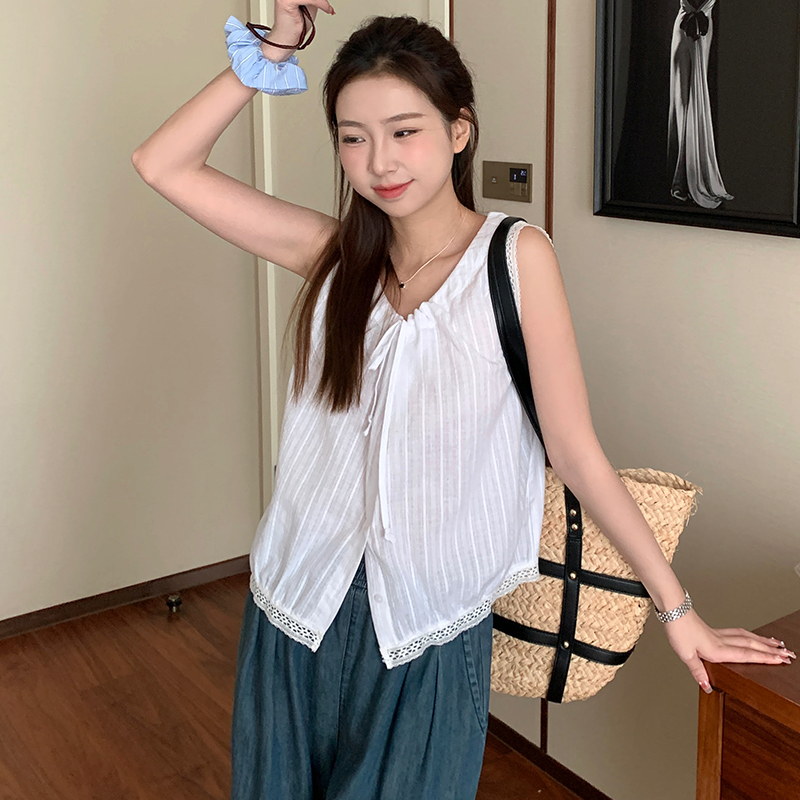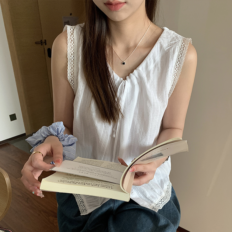 宽松显瘦无袖 花边休闲V领露肩衬衫 韩版 新款 宽松上衣 女2024夏季