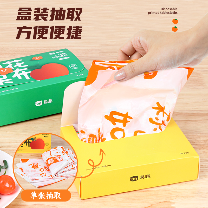 心想柿橙印花一次性桌布长方形加厚防水防油圆桌餐台布盒装 抽取式