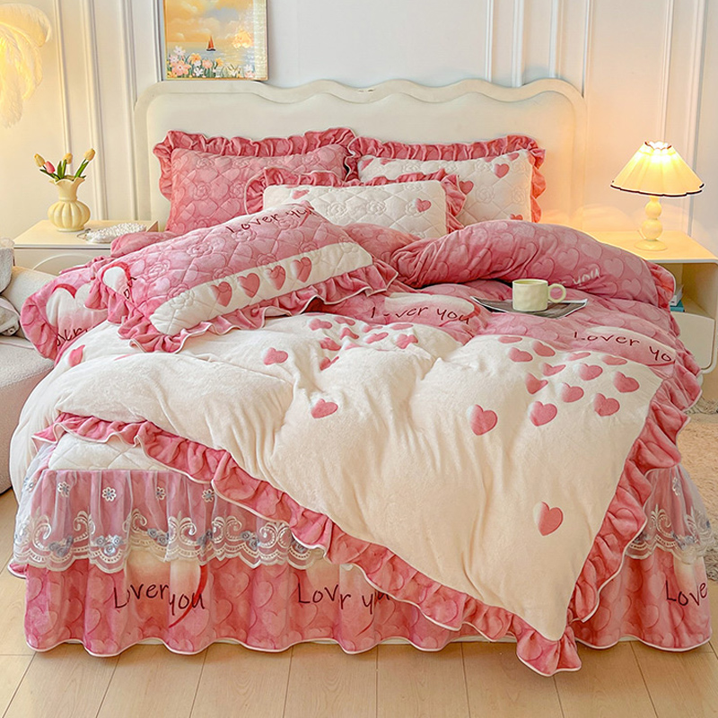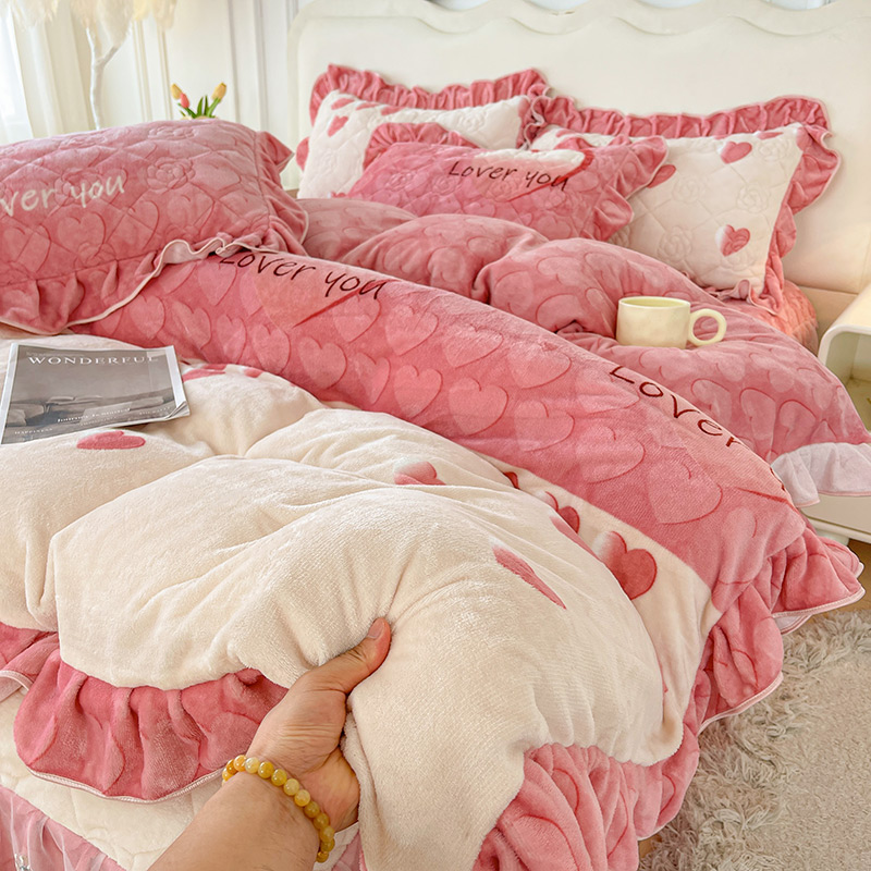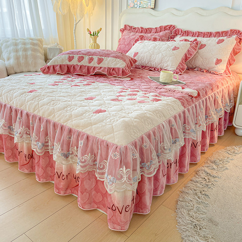 小清新牛奶绒夹棉床裙四件套双面加绒法兰珊瑚绒荷叶花边被套秋冬