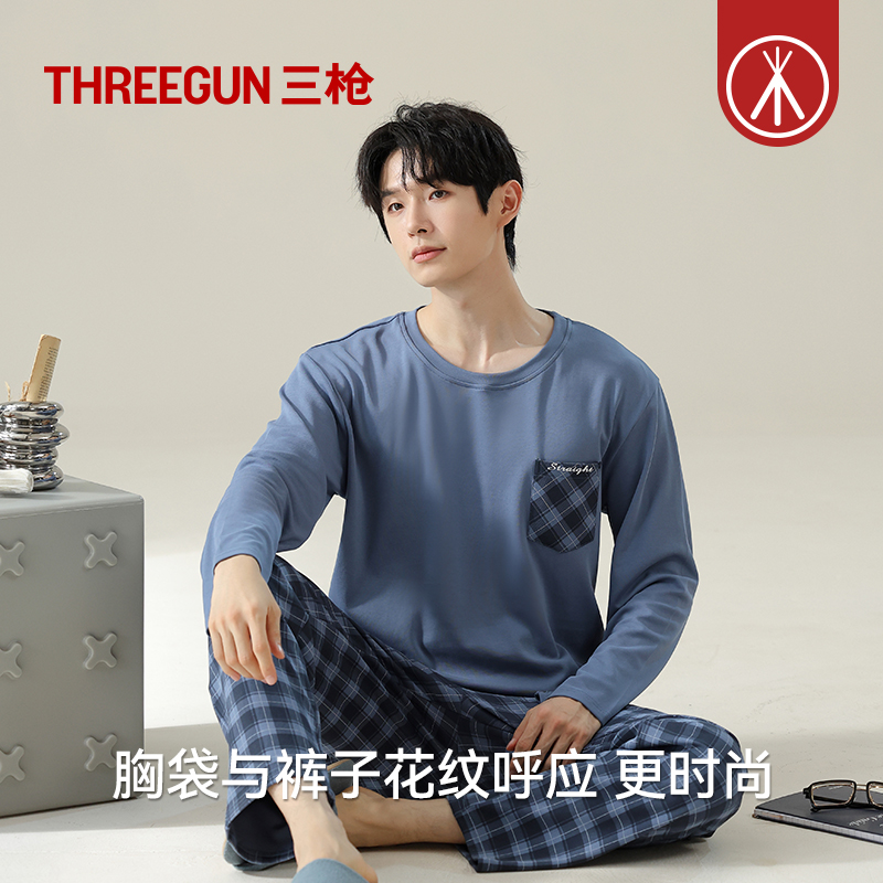 长裤 简约家居服套装 2025秋季 纯棉睡衣男纯色格子经典 新品 三枪长袖