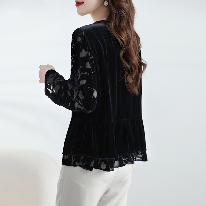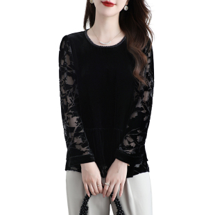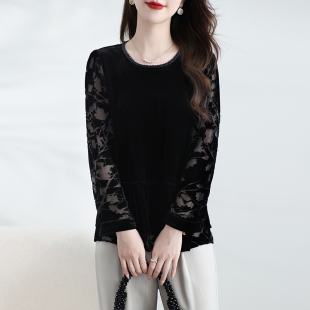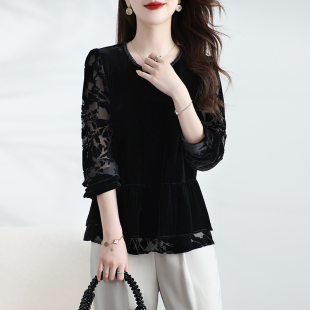 新款 桑蚕丝妈妈设计感小众气质减龄春秋 黑色真丝丝绒上衣女长袖