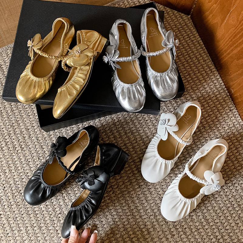 平底褶皱浅口一字带芭蕾舞单鞋 花朵懒人一脚蹬单鞋 法式 羊皮版
