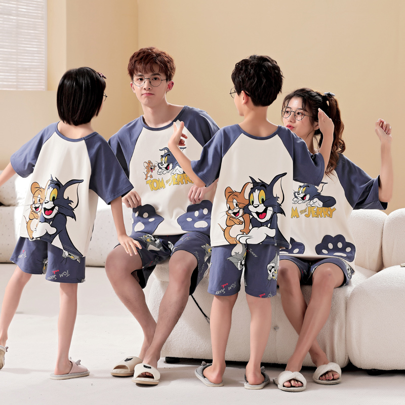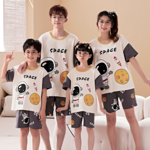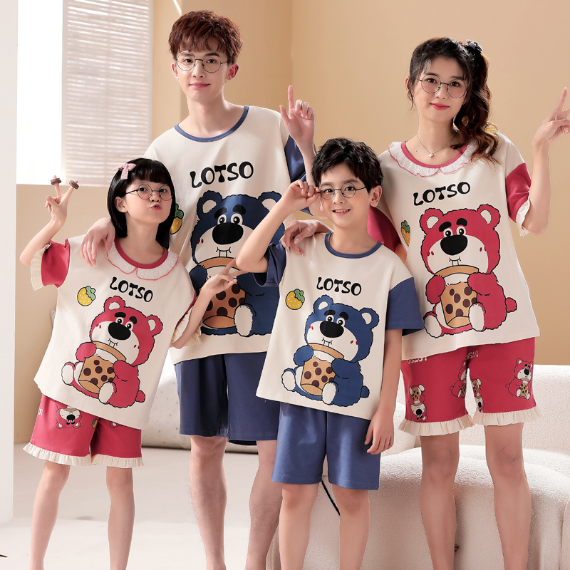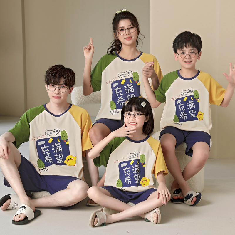 薄款 一家三口四口睡衣家居服套装 短裤 妈妈情侣短袖 纯棉 亲子母女装