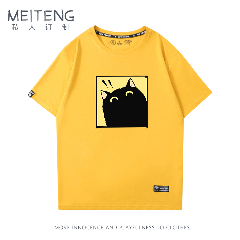 可爱萌宠黑猫探头惊叹无语表情印花短袖 日系创意插画宽松T恤男女