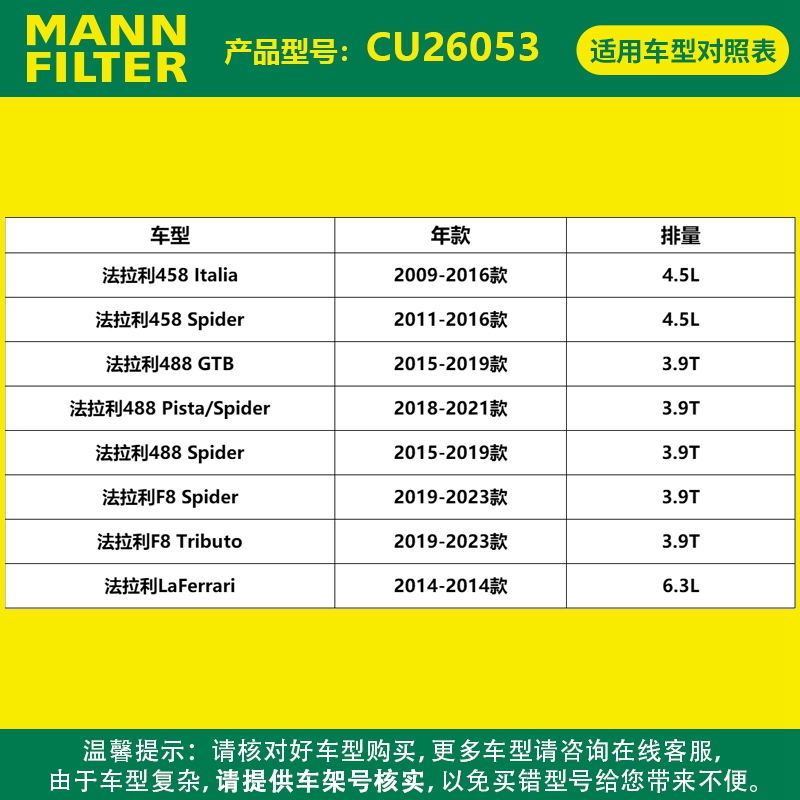 LaFerrari 曼牌滤清器CU26053空调滤芯格适用法拉利458 488