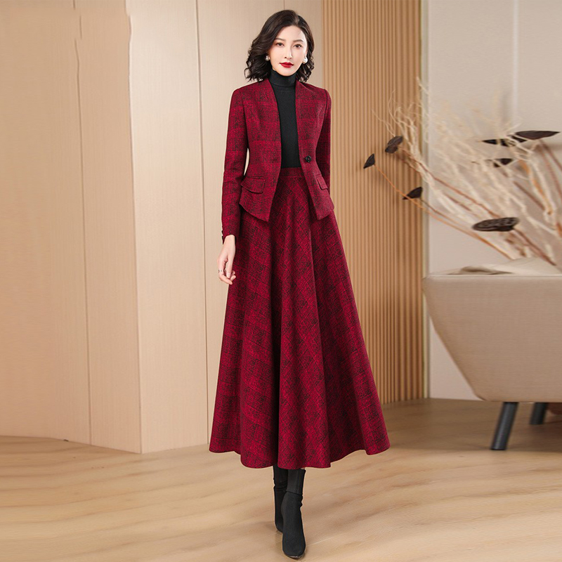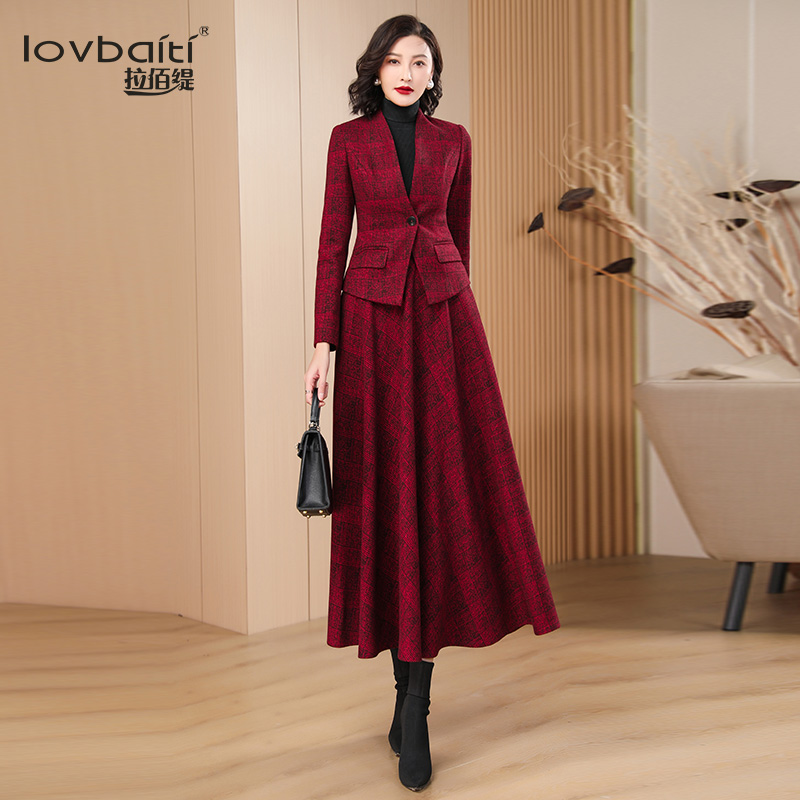 中长款 红色格子毛呢套装 修身 两件套高端时尚 半身裙647 女2024新款