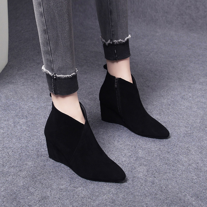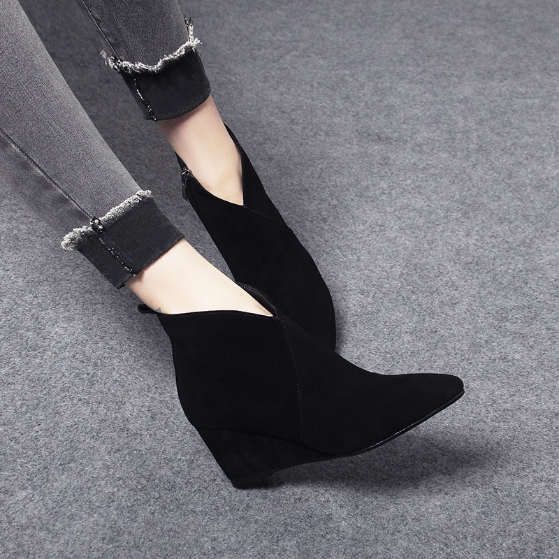 尖头坡跟短靴女2025新款 羊皮女靴真皮春秋单靴 秋冬磨砂绒面高跟鞋
