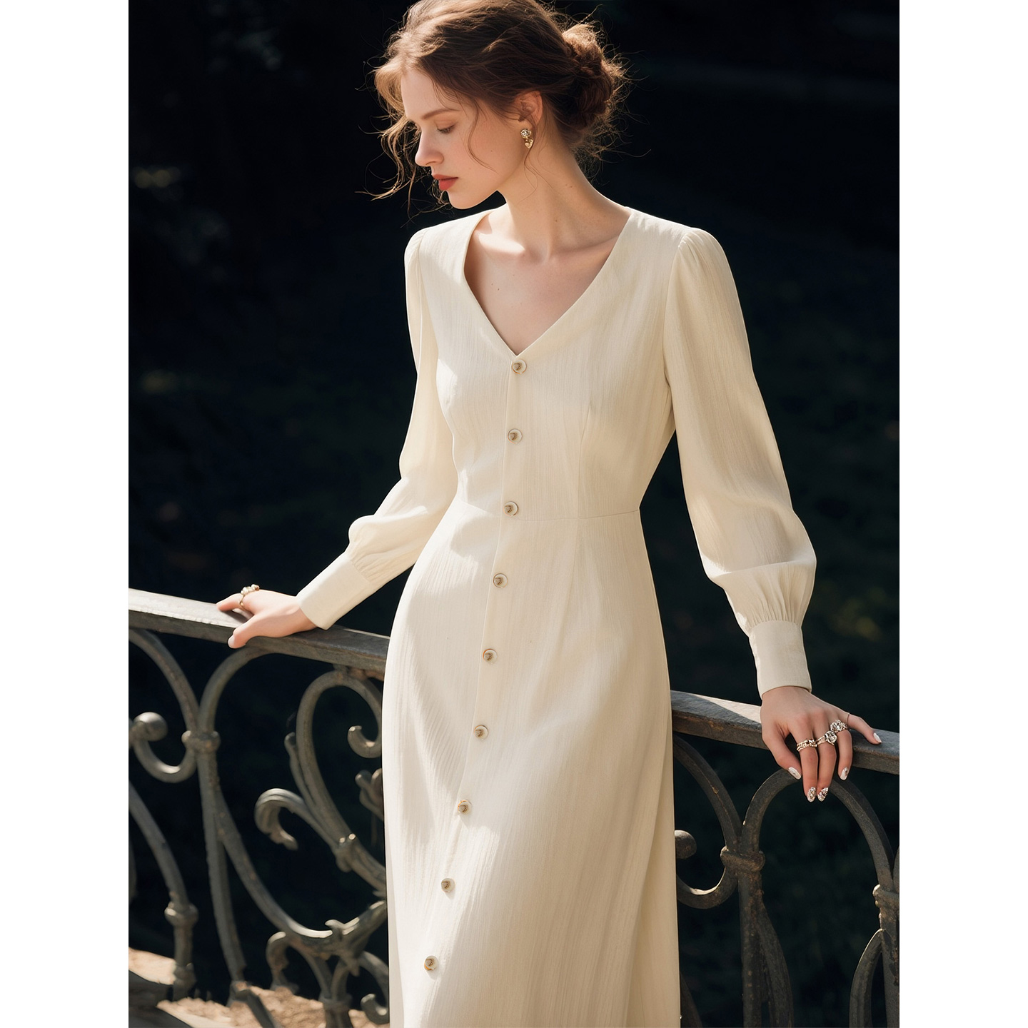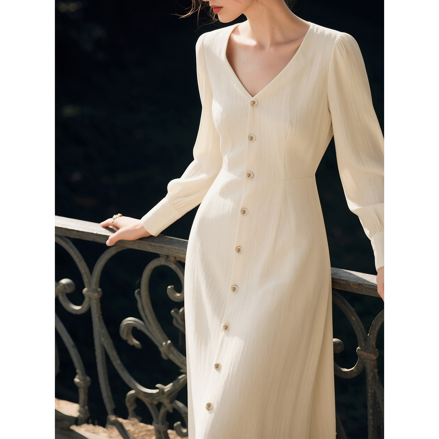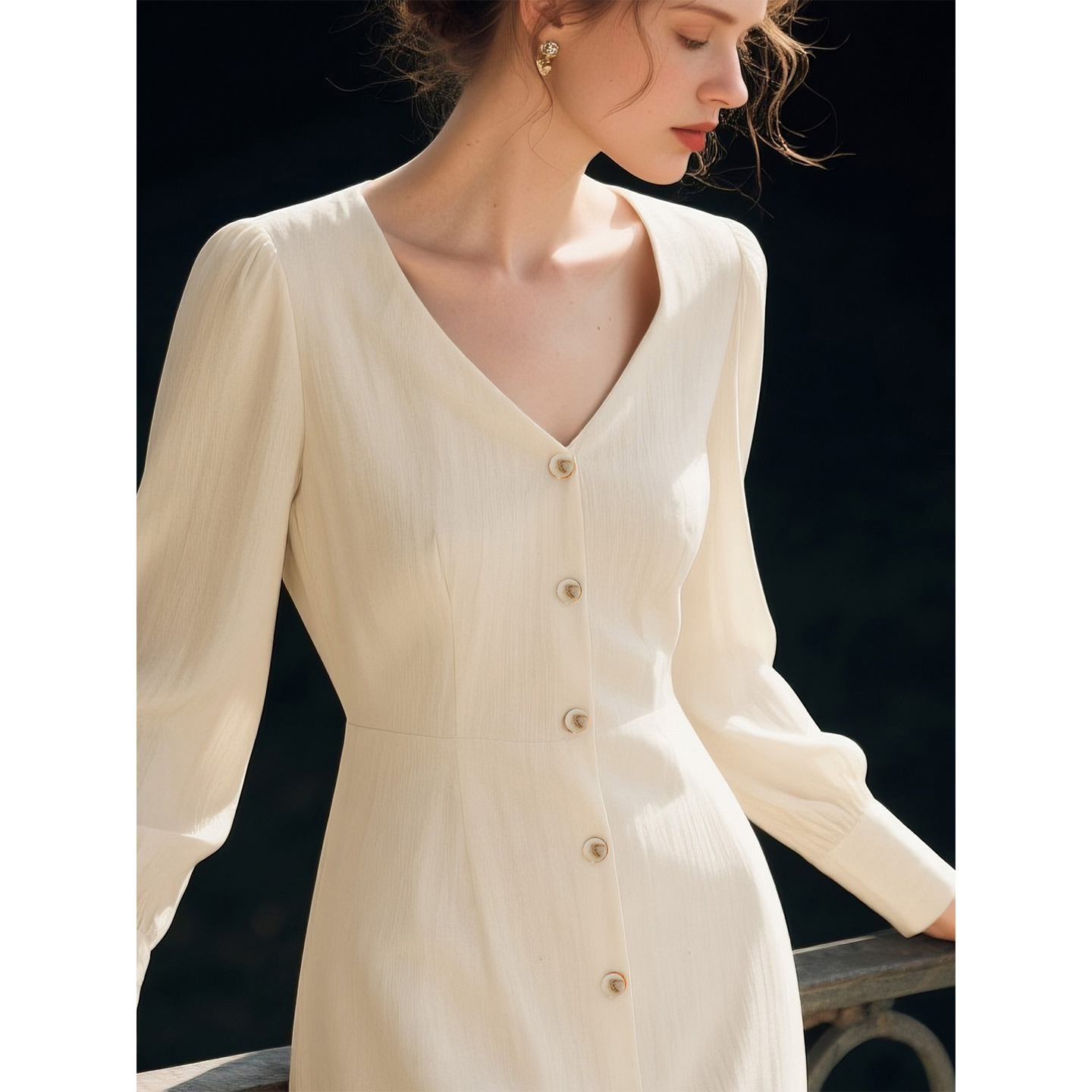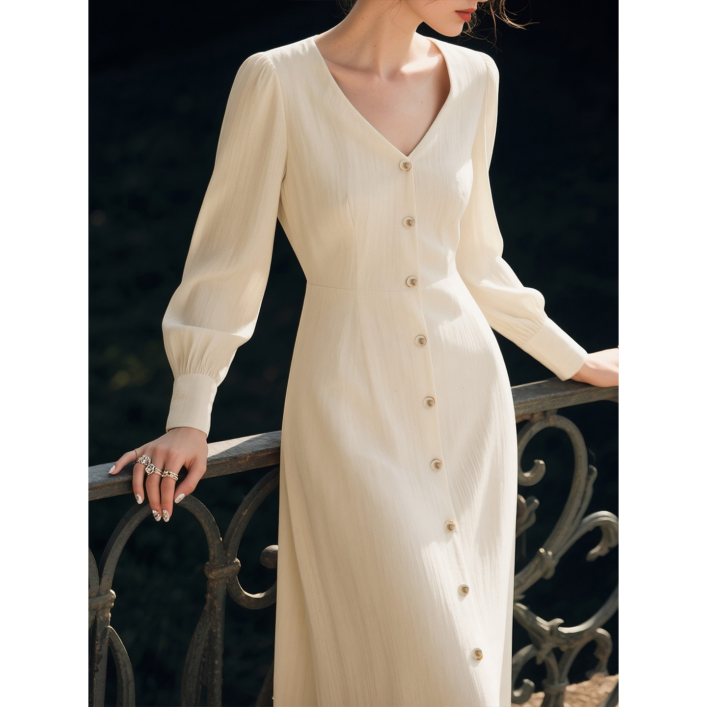 巨好看 V领长袖 早秋裙子 2025新款 杏色天丝亚麻醋酸连衣裙女秋季