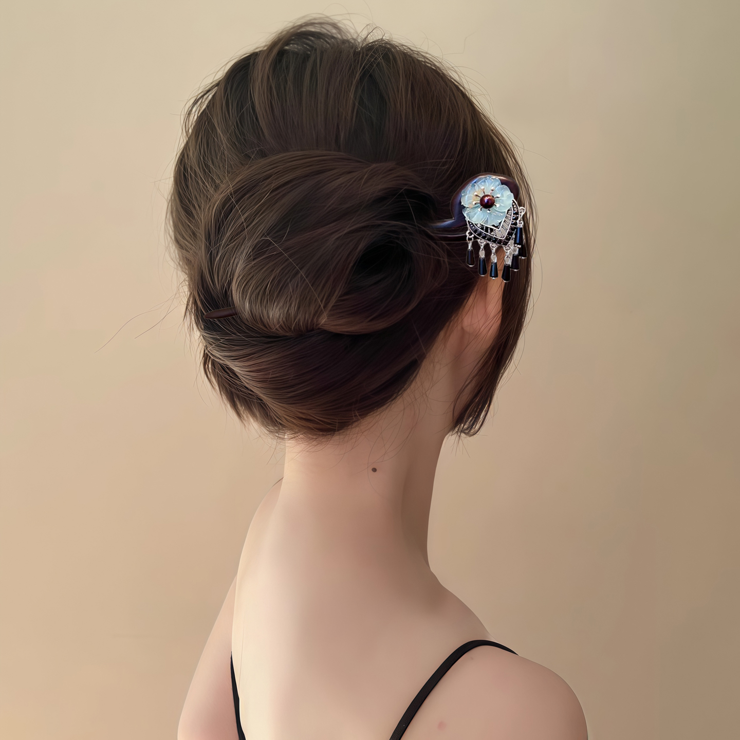 气质花朵黑檀木发簪女古风高级感流苏盘发簪子新中式 发钗汉服拎环
