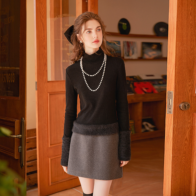 白鹿语高领拼接毛毛上衣25冬款 气质温柔简约百搭显瘦打底针织T恤