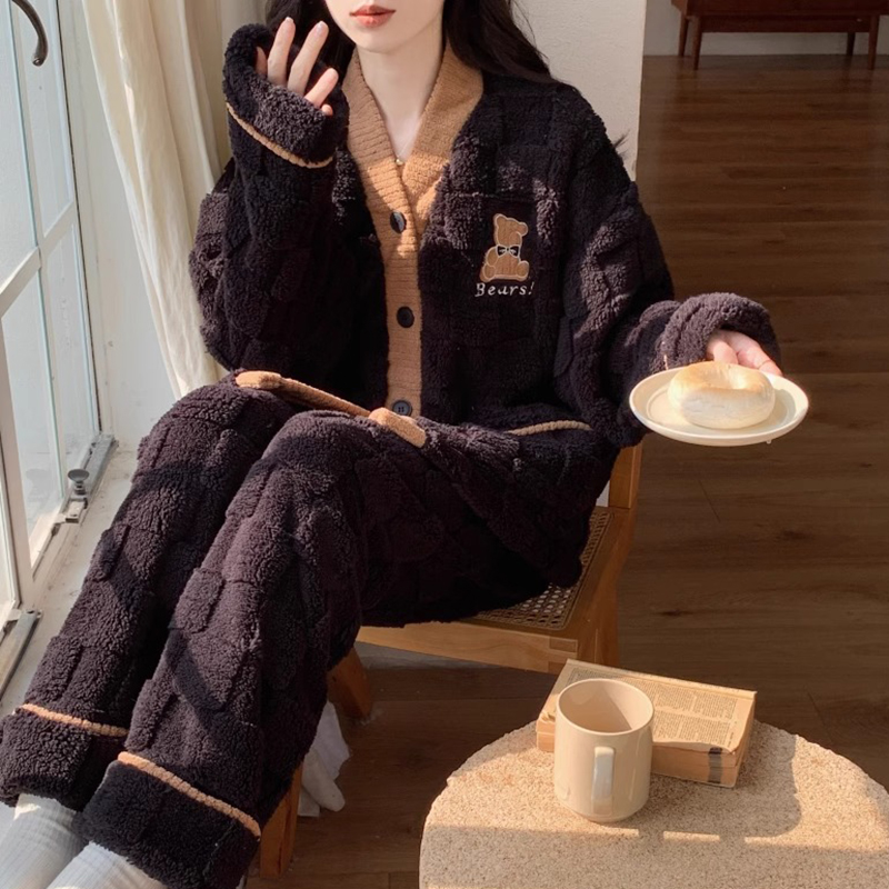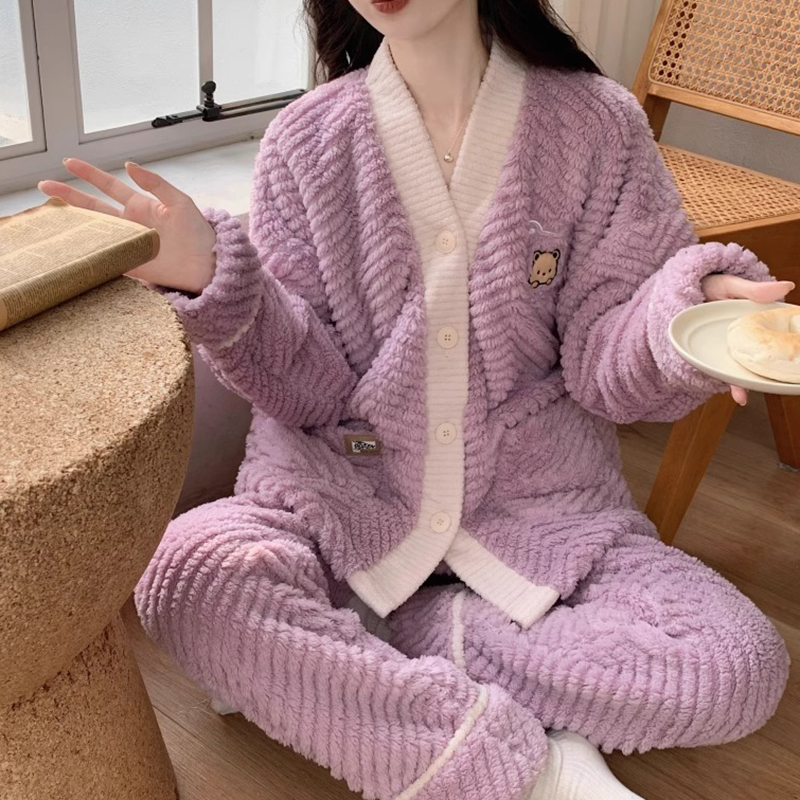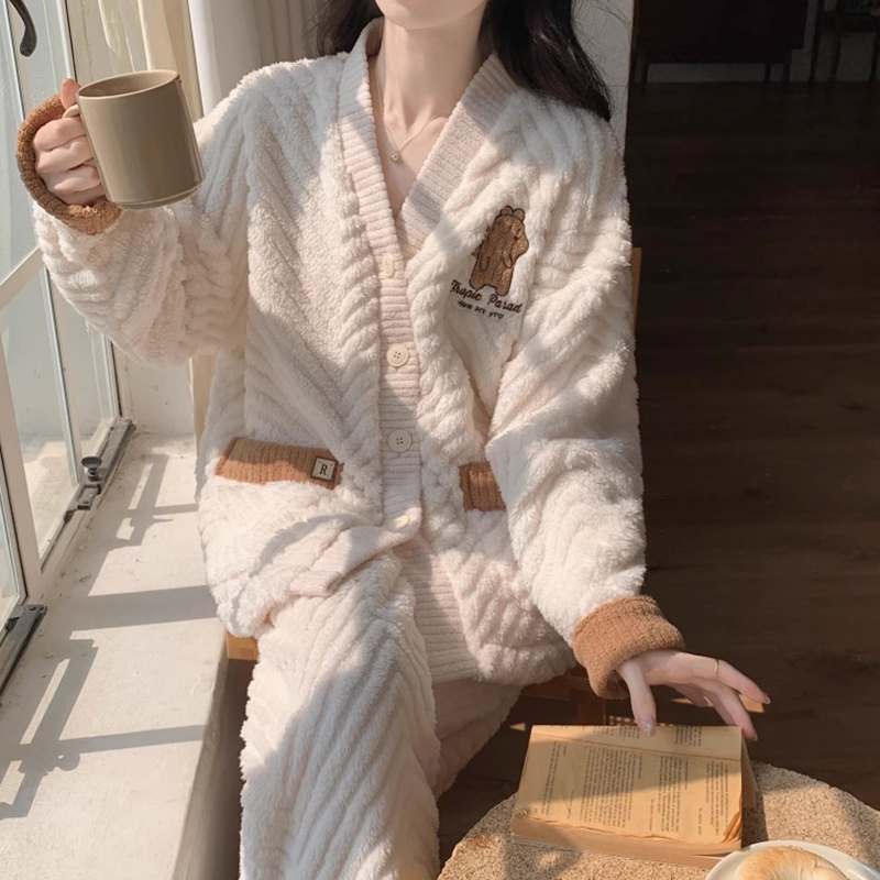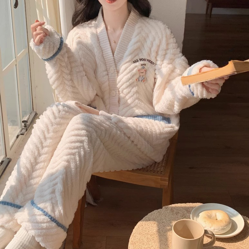 套装 睡衣女秋冬季 法兰绒家居服2025新款 纽扣网红款 加厚珊瑚绒开衫