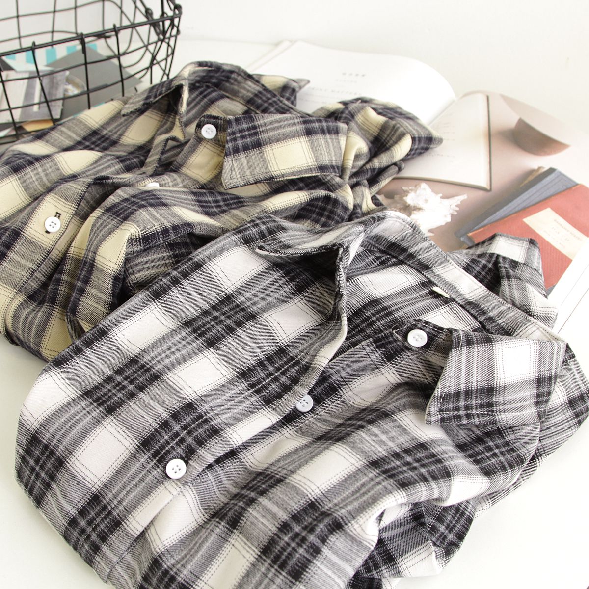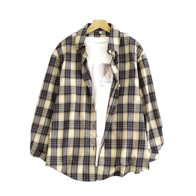 慵懒宽松落肩休闲秋季 女中长款 chic复古格纹衬衣潮流 衬衫 森马长袖