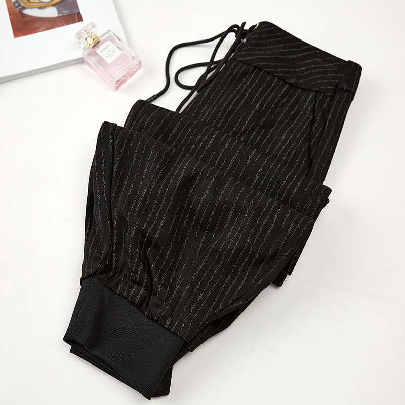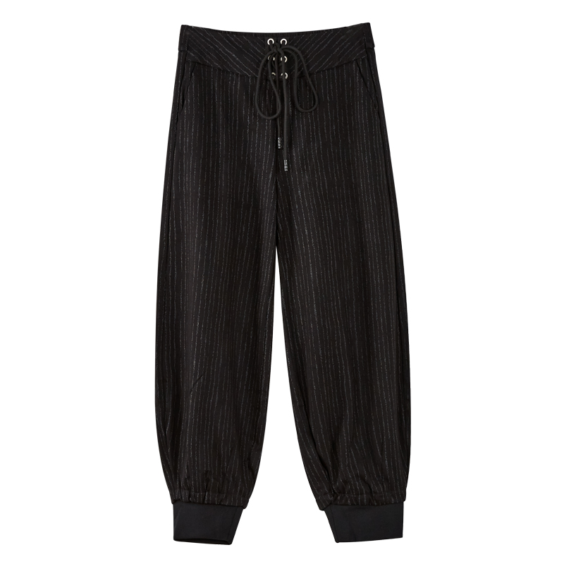 女装 大码 九分灯笼裤 系带抽绳条纹休闲裤 秋季 子小脚宽松阔腿裤 新品