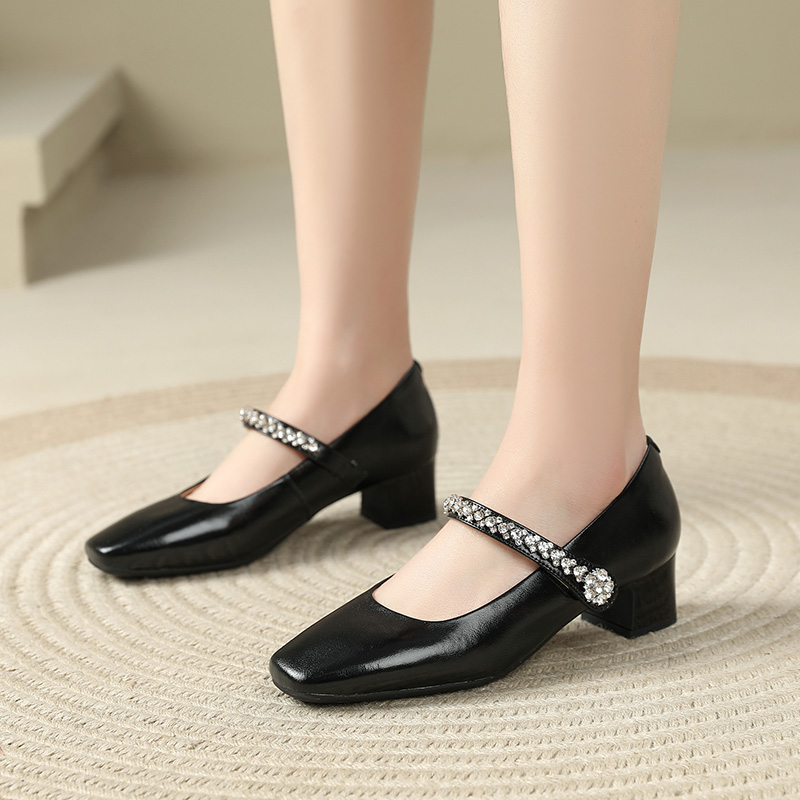 中跟小皮鞋 浅口妈妈鞋 春夏新款 粗跟大码 水钻一字扣女单鞋 真皮法式