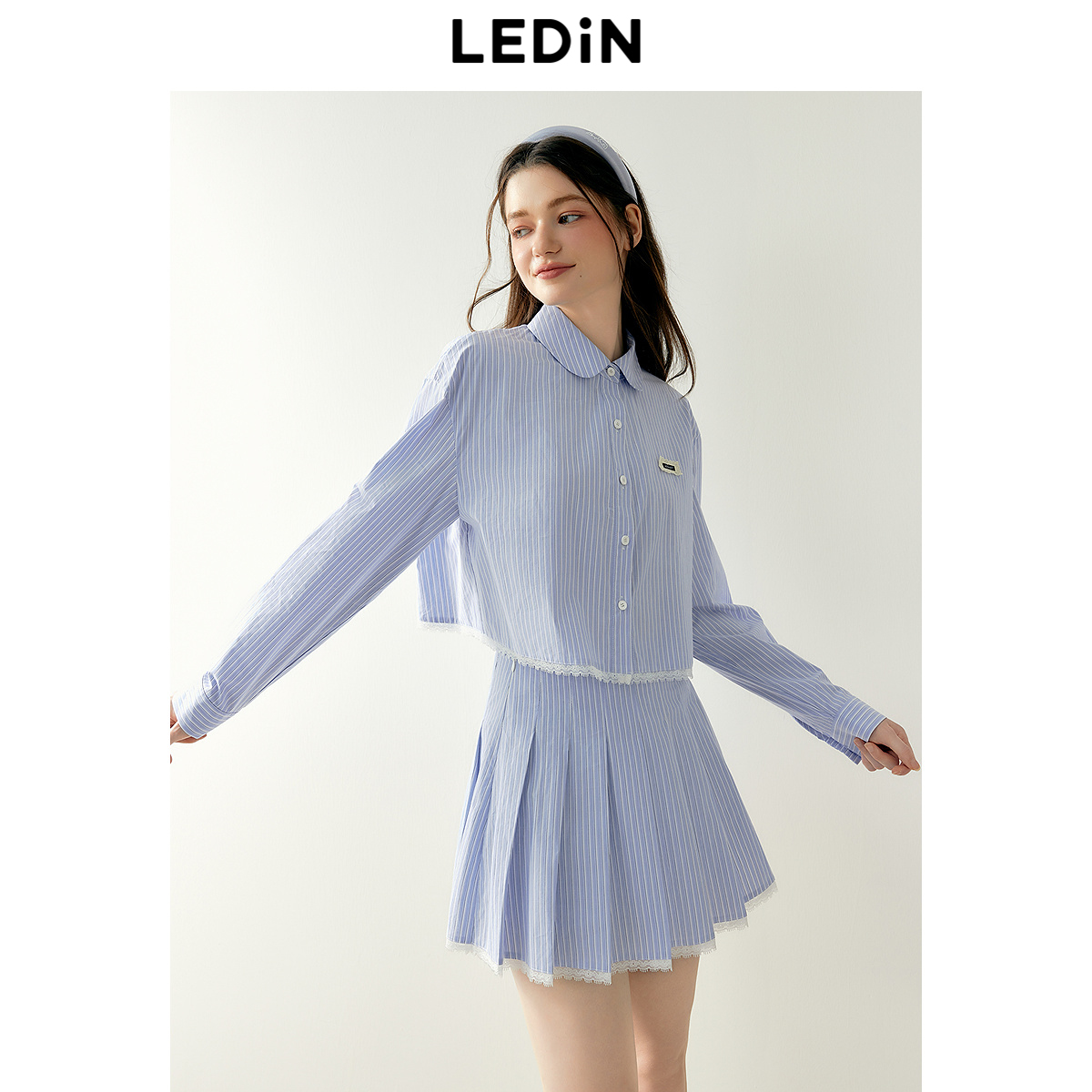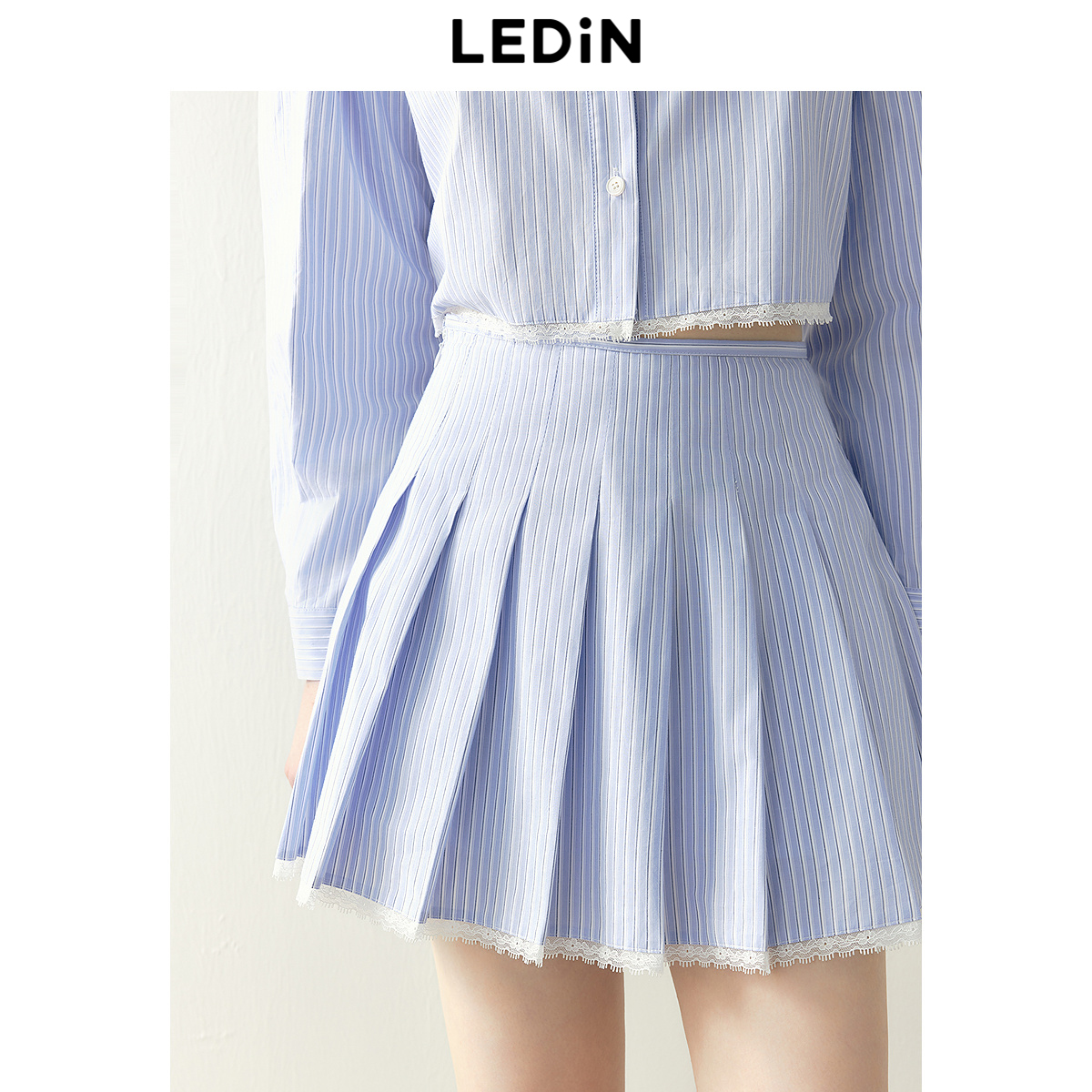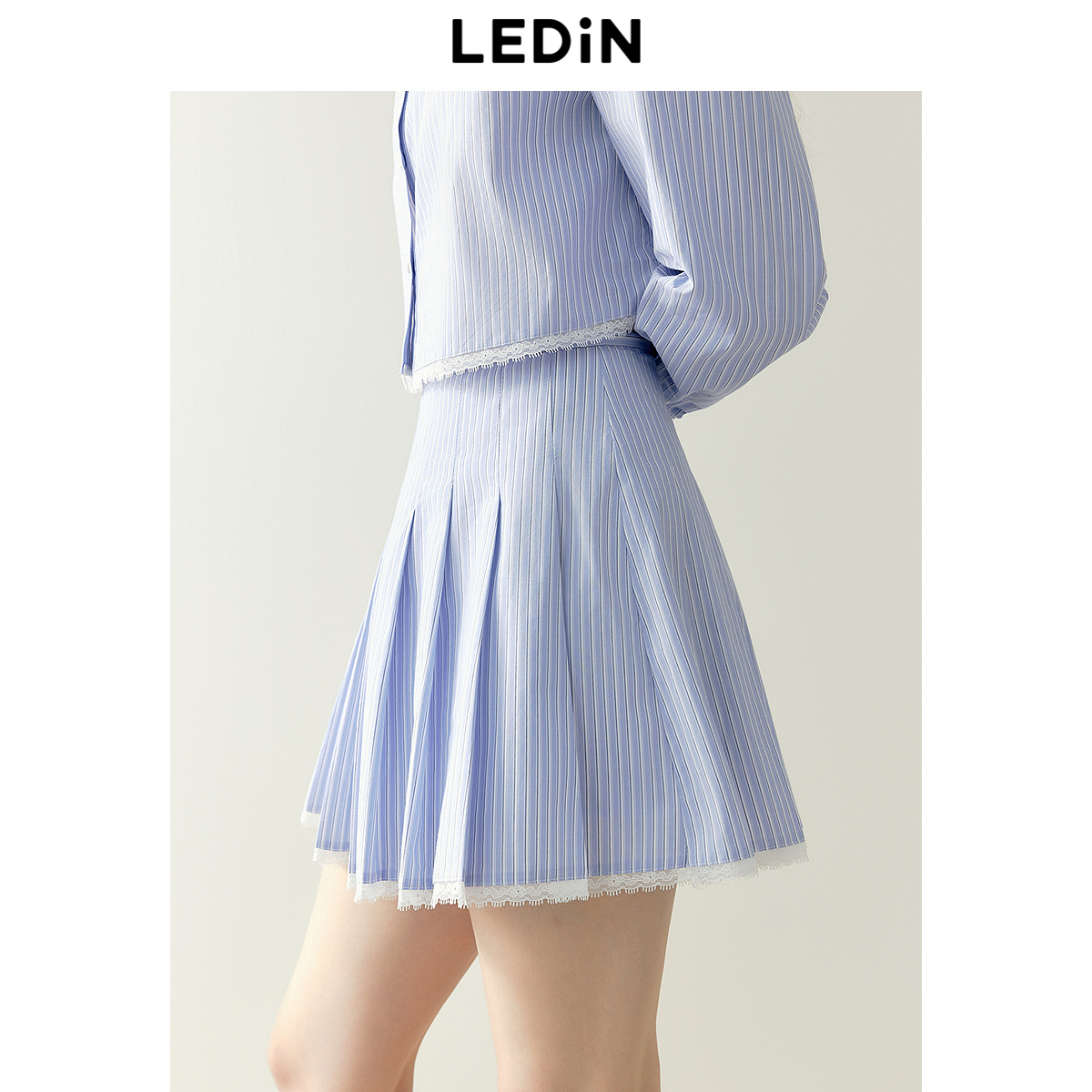 裙设计感半身裙 蓝条纹衬衫 乐町甜美蕾丝边百褶短裙春季 新款