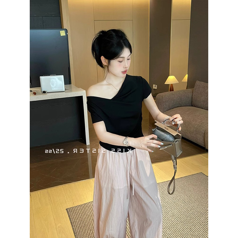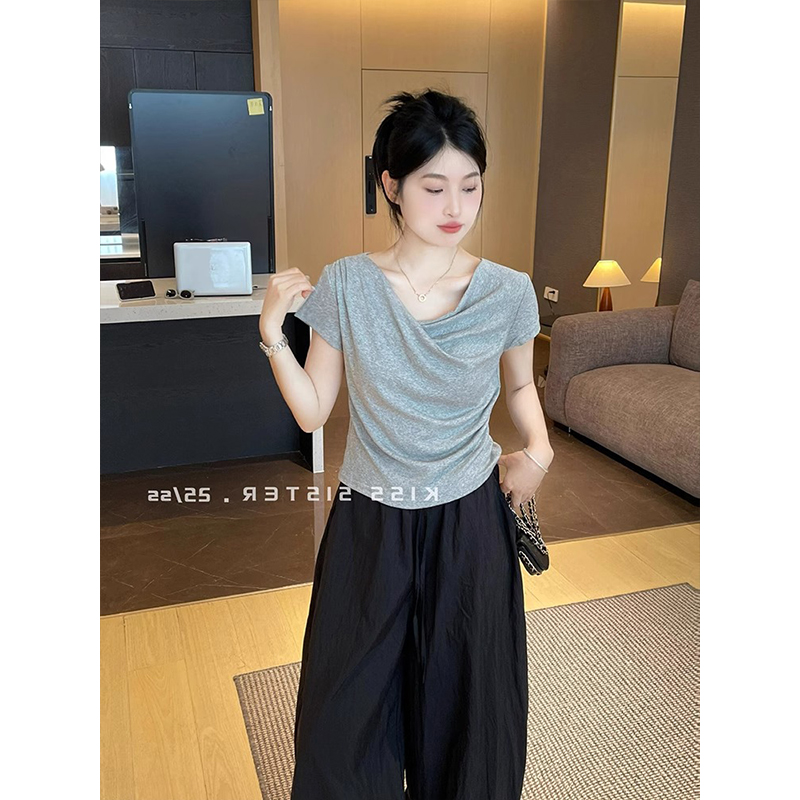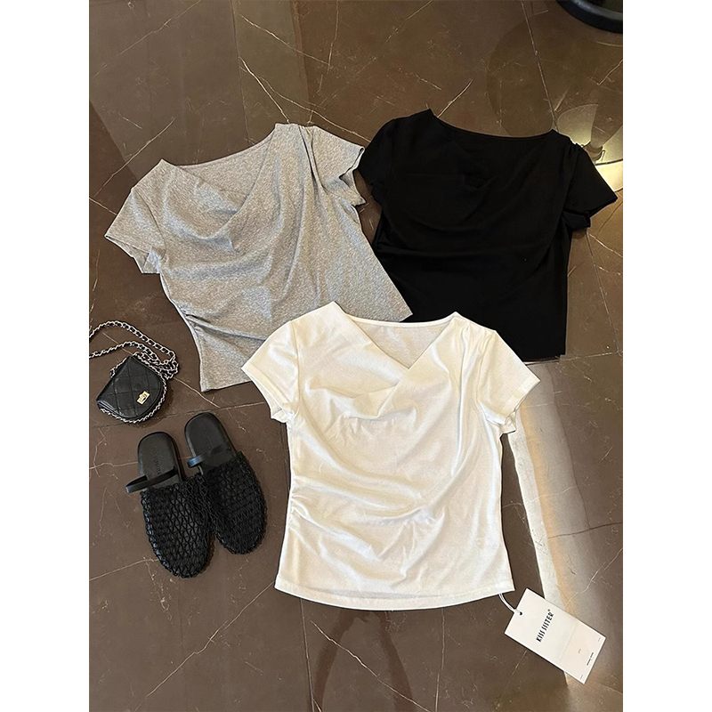 v领短款 设计感独特漂亮褶皱修身 上衣 t恤女夏季 白色不规则荡领短袖