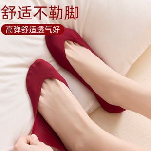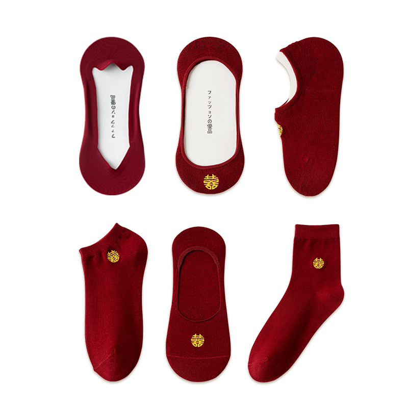 婚袜船袜 隐形新郎新娘高跟鞋 冰丝酒红色袜子结婚情侣一对女款 男士