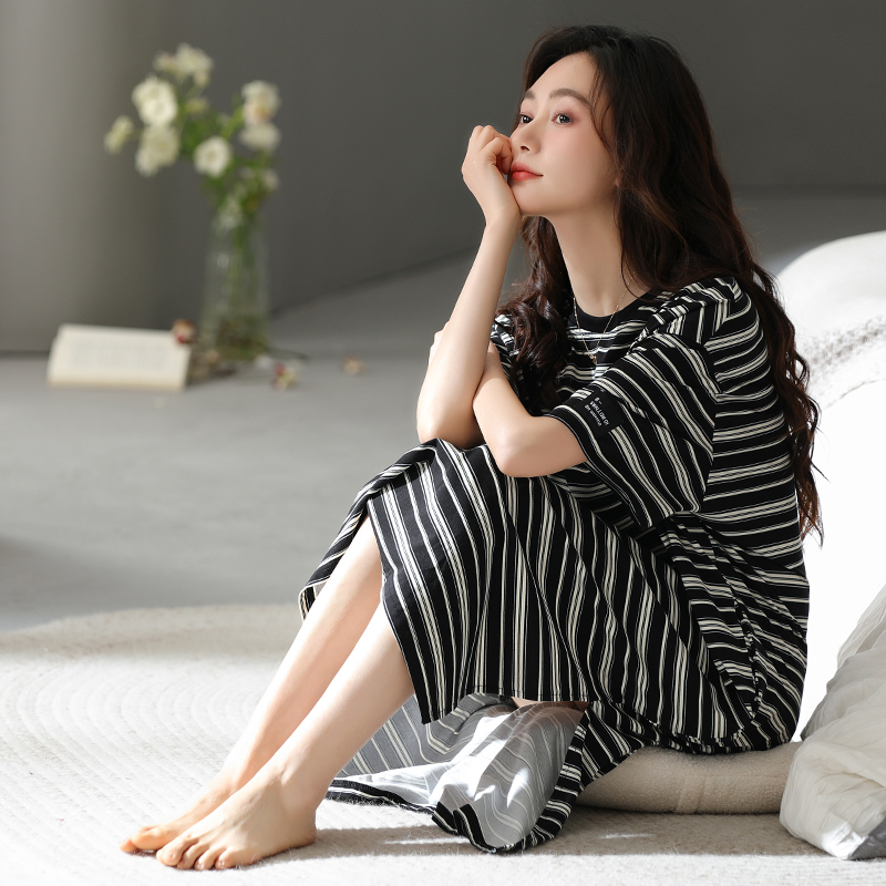 夏天冰丝孕妇夏款 长裙薄款 条纹家居服 莫代尔短袖 睡裙女士睡衣夏季