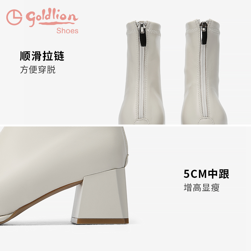 金利来真皮短筒白色短靴女秋冬粗跟女靴百搭中跟后拉链方头瘦瘦靴