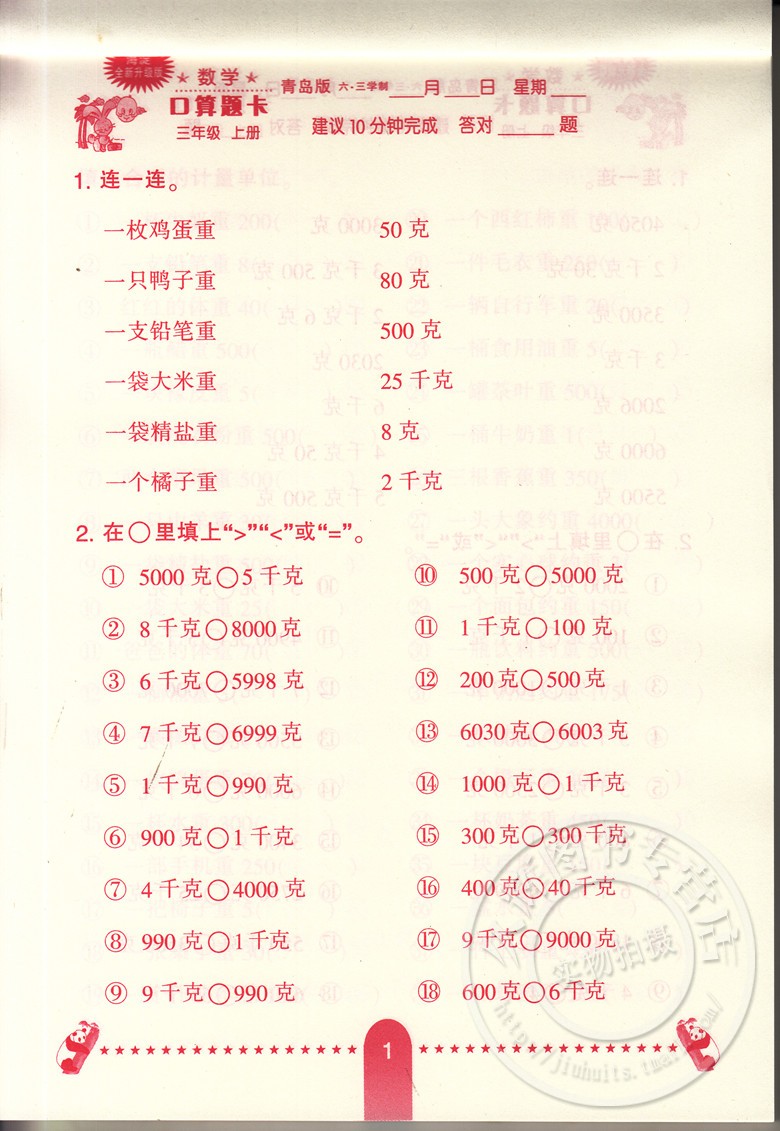 心算口算速算巧算小学生3年级数学口算题卡六三制 6.3学制三年级上册小学生10分钟口算题海淀全新升级版 新版 数学口算题卡青岛版