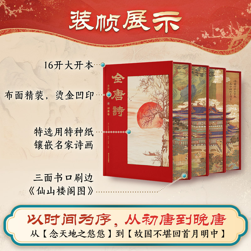 全唐诗 限量鲜章 全彩插图全4册 布面仿绒布函套特装 礼盒刷边中国古诗词唐诗三百首过年送礼鉴赏 书精装 赠敦煌宝相丝巾