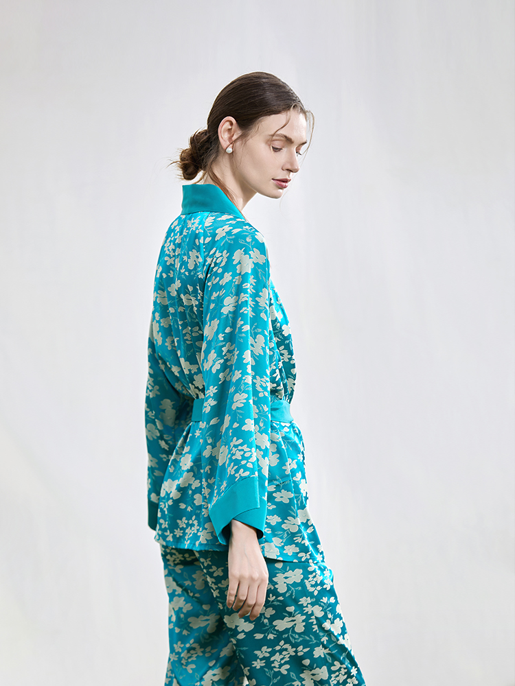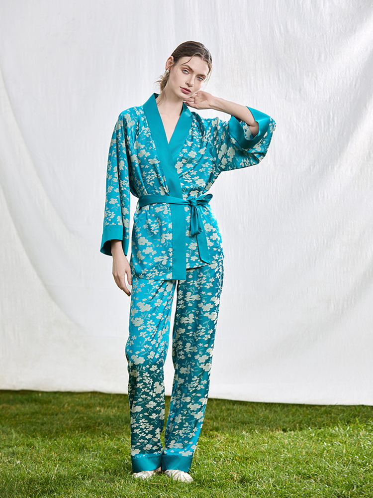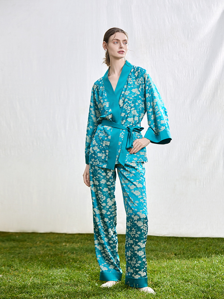系带睡袍家居服两件套装 NoirTease春秋薄款 丝质印花睡衣女士长袖
