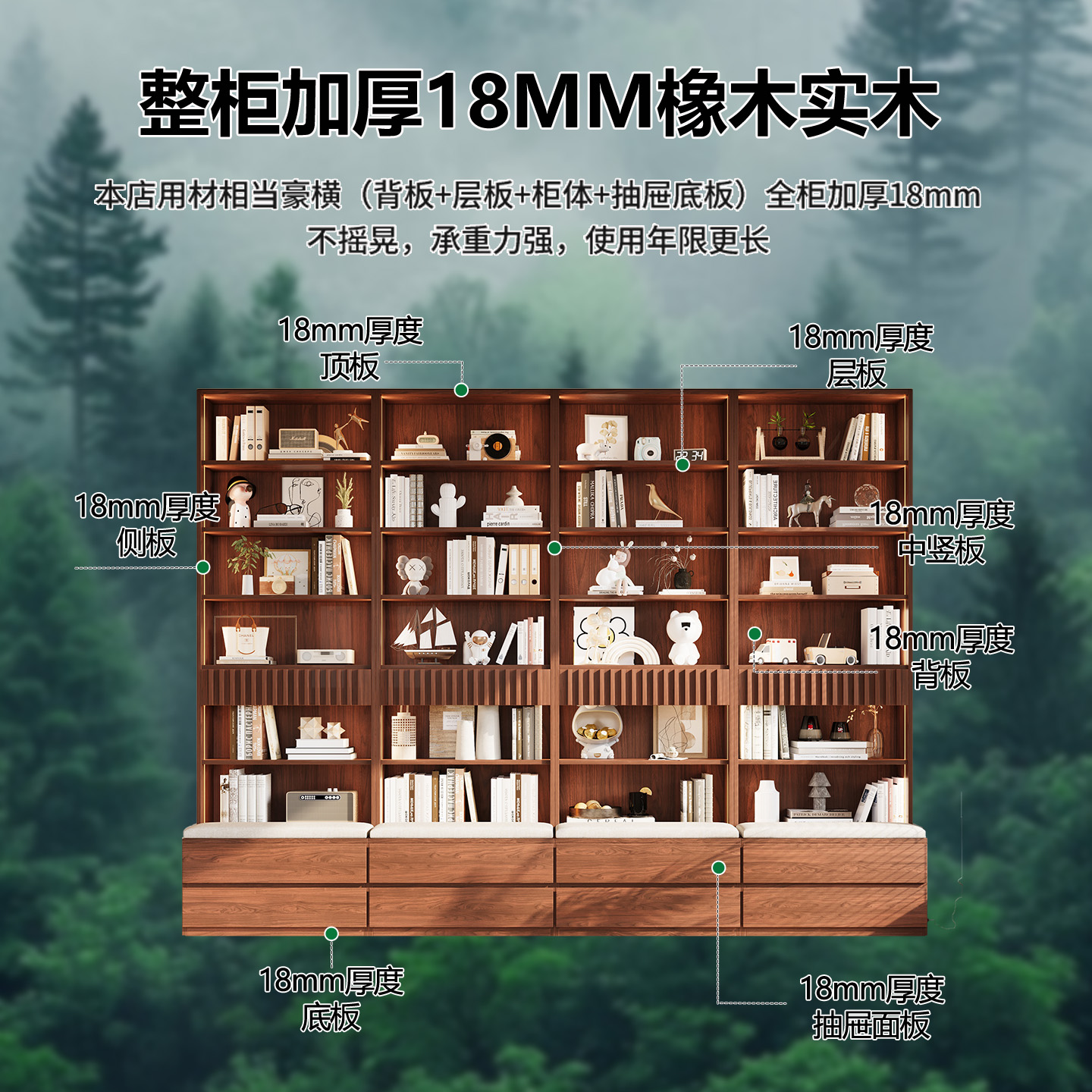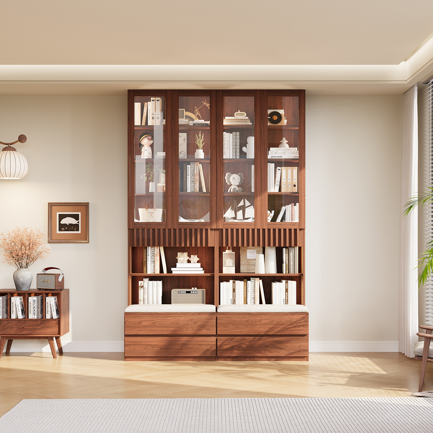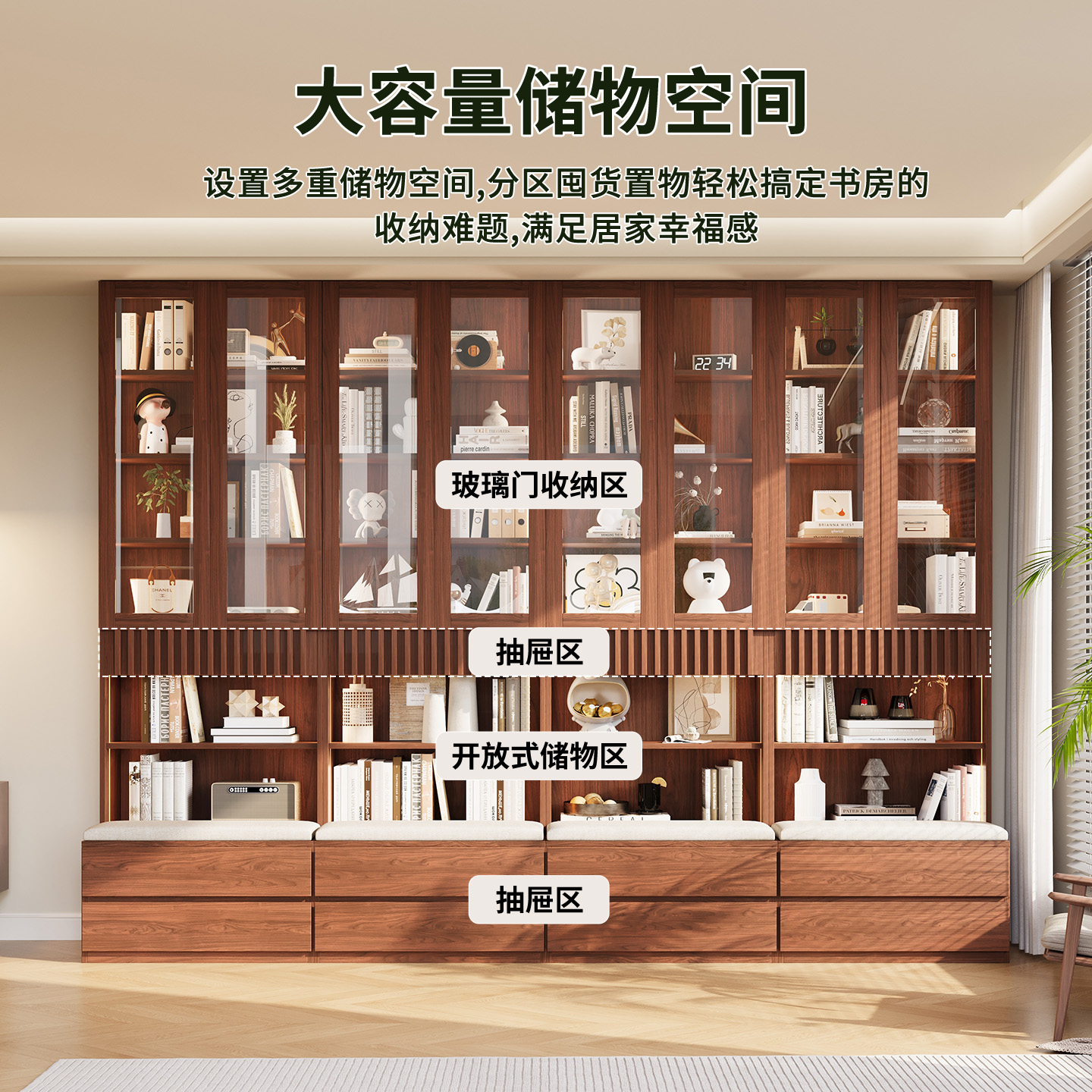 中古风实木书柜储物柜客厅家用2025新款 一体靠墙带玻璃门置物架