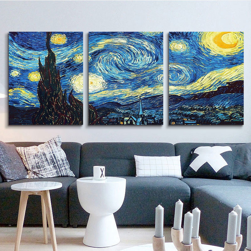 diy数字油画客厅抽象风景三联三拼大幅手绘填色装 梵高星空画 饰画