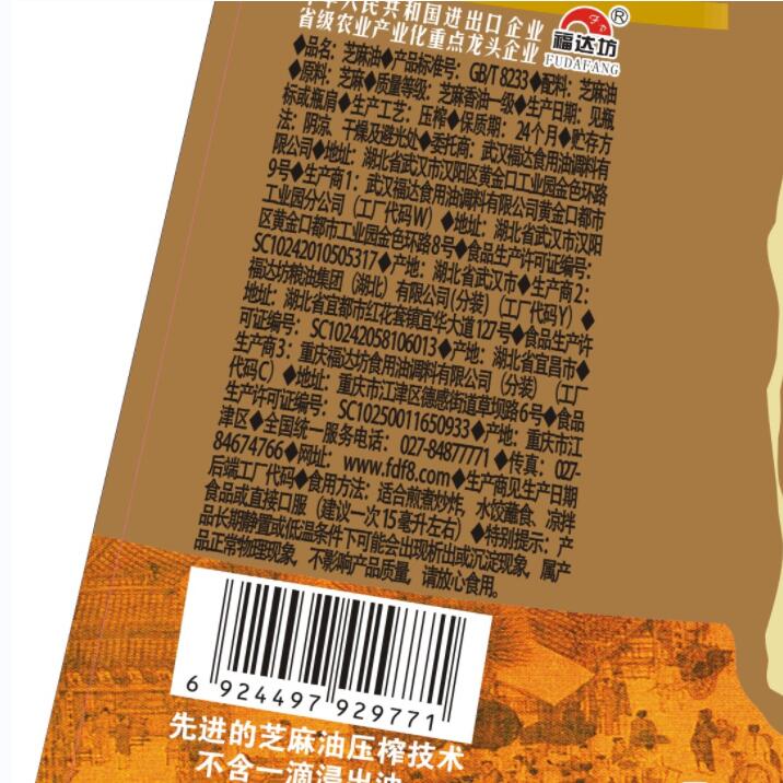 福达坊头道香初榨白芝麻油香油518ml月子油玻璃瓶凉拌火锅TD