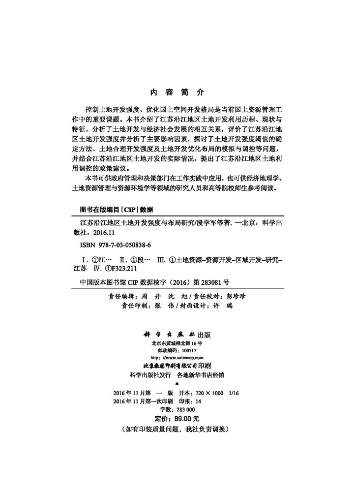 江苏沿江地区土地开发强度与布局研究科学出版 社