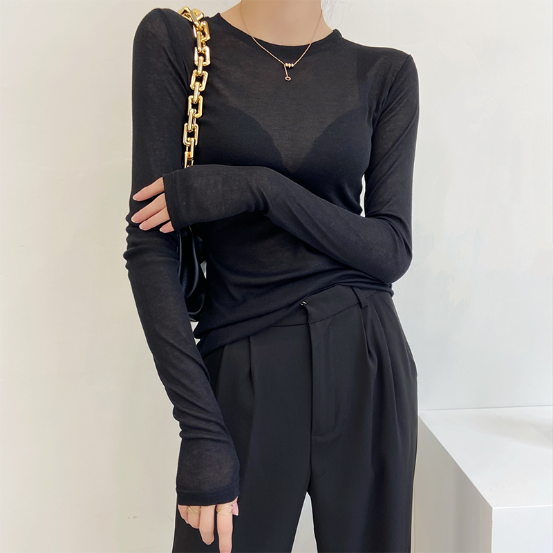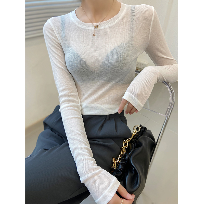 面膜长袖 透视内搭轻熟上衣网纱薄款 t恤 女早秋修身 咖色微透打底衫