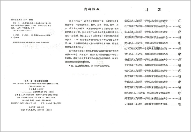 文化课强化训练英语一模 2019年版 仅试卷 上海高考一模卷英语 上海市各区高三高中第一学期期末质量抽查模拟试卷精编 领先一步英语