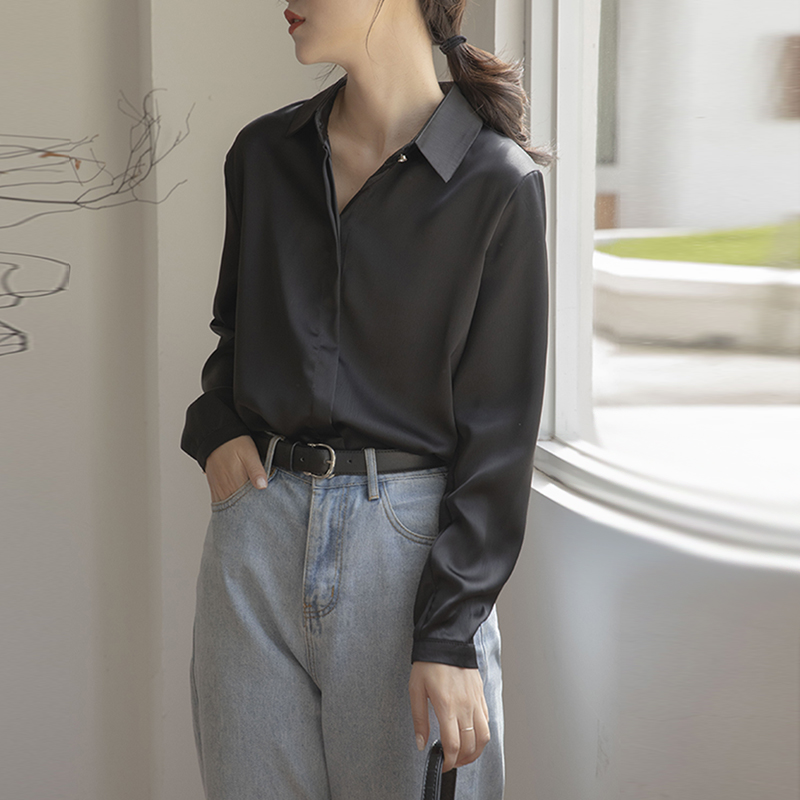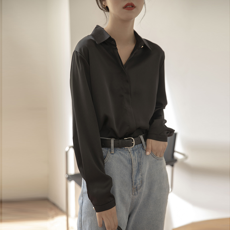缎面上衣春大学生职业面试衬衣 洋气长袖 黑色衬衫 女设计感港风法式